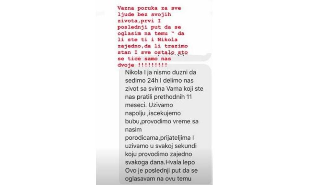 -Važna poruka za sve ljude bez svojih života, prvi i poslednji put da se oglasim na tu temu "da li ste ti i Nikola zajedno, da li tražimo stan i sve ostalo što se tiče samo nas dvoje!!!!! Nikola i ja nismo dužni da sedimo 24h dnevno i delimo naš život sa svima vama koji ste nas pratili prethodnih 11 meseci. Uživamo napolju, iškekujemo bebu, provodimo vreme sa našim porodicama, prijateljima i uživamo u svakoj sekundi koju provodimo zajedno svakoga dana. Hvala lepo. Ovo je poslednji put da se oglašavam na tu temu.