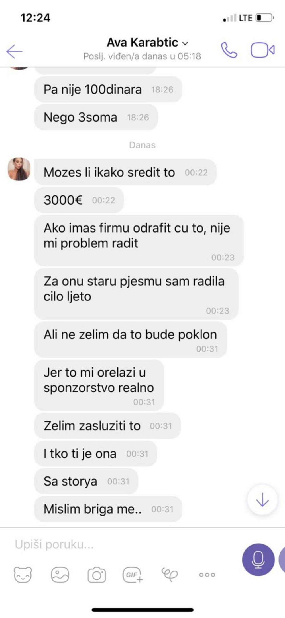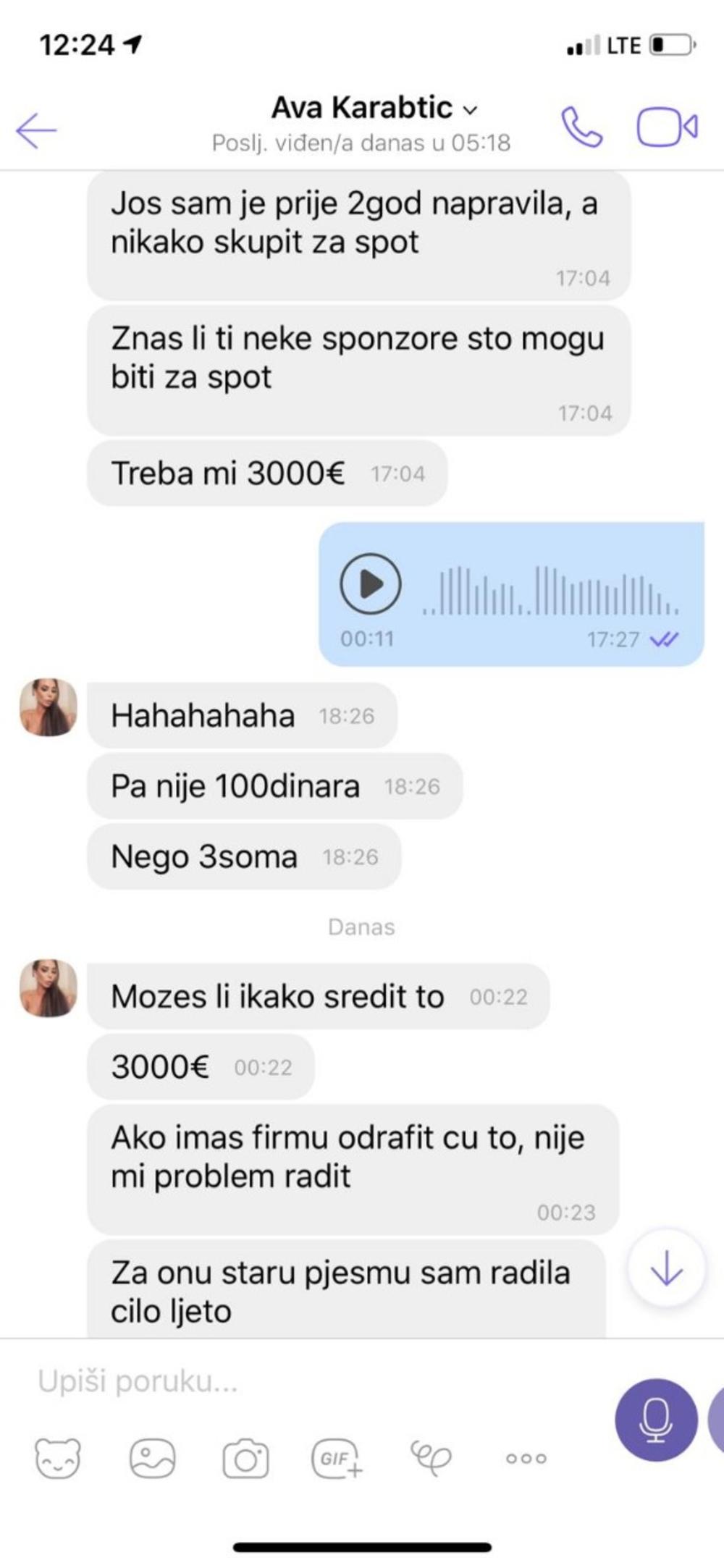 Ostali smo šokirani Avom i njenim ponašanjem. Započela je razgovor tako što je kukala kako joj trebe usluga i tražila je od njega 3.000 evra za spot jer ona "jadna" ne može sama da skupi toliko para.