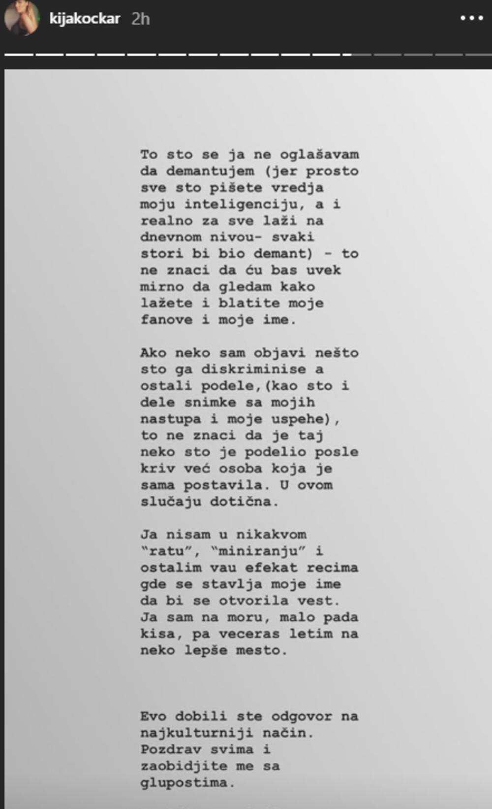 "To što se ja ne oglašavam da demantujem (jer prosto sve što pišete vređa moju inteligenciju, a i realno za sve laži na dnevnom nivou - svaki stori bi bio demant) to ne znači da ću baš mirno da gledam kako lažete i kako blatite moje fanove i moje ime. Ako neko objavi sam nešto što ga diskriminiše a ostali podele (kao što i dele snimke s mojih nastupa i moje uspehe), to ne znači da je taj neko što je podelio posle kriv, već osoba koja je sama postavila. U ovom slučaju dotična", napisala je Kija.