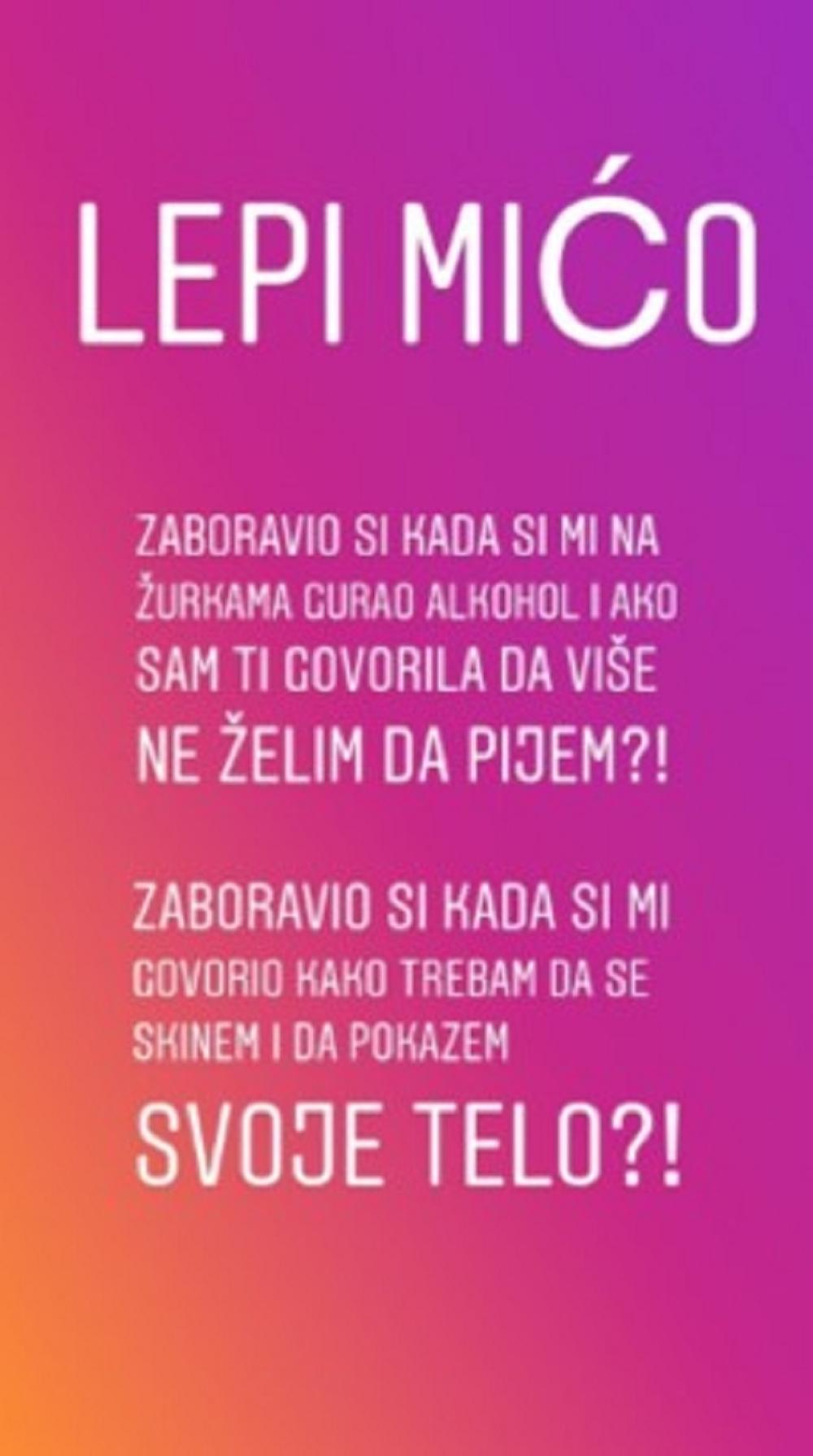 "Lepi Mićo, zaboravio si kada si mi na žurkama gurao alkohol iako sam ti govorila da više ne želim da pijem?! Zaboravio si kada si mi govorio kako trebam da se skinem i da pokažem svoje telo", poručila je Dorotea i dodala: