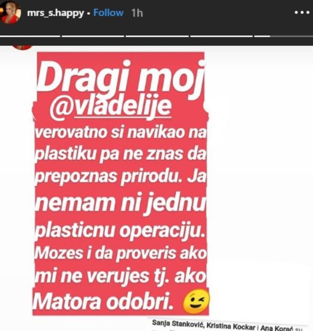 "Dragi moj Vladimire, verovatno si navikao na plastiku, pa ne znaš da prepoznaš prirodu. Ja nemam nijednu plastičnu operaciju. Možeš i da proveriš ako mi ne veruješ tj. ako ti Matora odobri", napisala je ona.