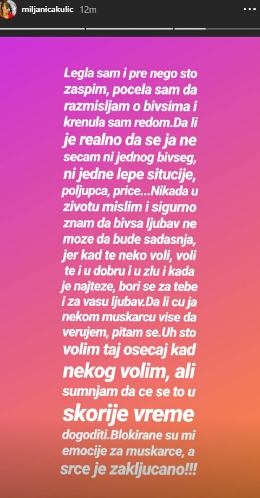 "Legla sam i pre nego što zaspim, počela sam da razmisljam o bivšima i krenula sam redom. Da li je realno da se ja ne sećam nijednog bivšeg, nijedne lepe situacije, poljupca, priče... Nikada u životu, mislim i sigumo znam da bivša ljubav ne može da bude sadašnja, jer kad te neko voli, voli te i u dobru i u zlu i kada je najteže, bori se za tebe i za vašu ljubav. Da li ću ja nekom muškarcu više da verujem, pitam se? Uh, što volim taj osećaj kad nekog volim, ali sumnjam da će se to u skorije vreme dogoditi. Blokirane su mi emocije za muškarce, a srce je zakljucano", zaključila je Miljana.
