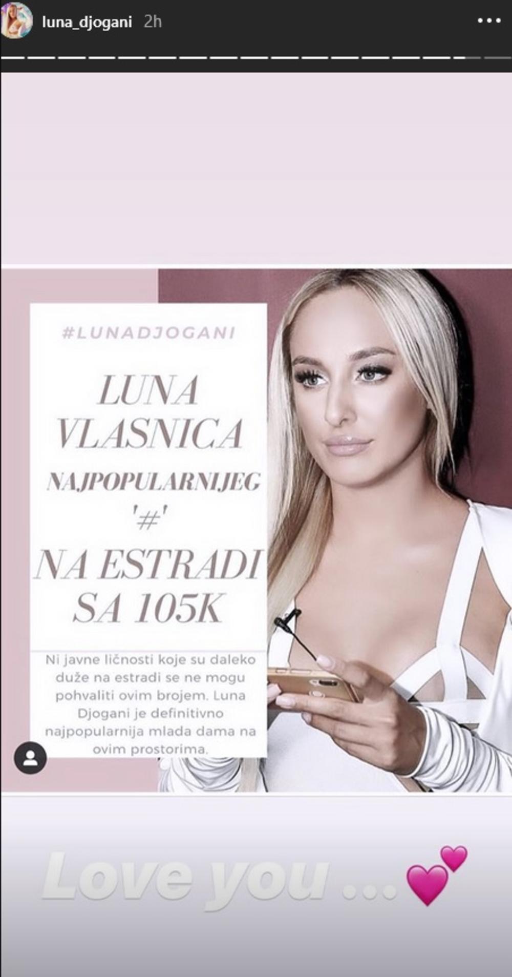 - Ni javne ličnosti koje su daleko duže na estradi se ne mogu pohvaliti ovim brojem. Luna Đogani je definitivno najpopularnija mlada dama na ovim prostorima - pisalo je u objavi.