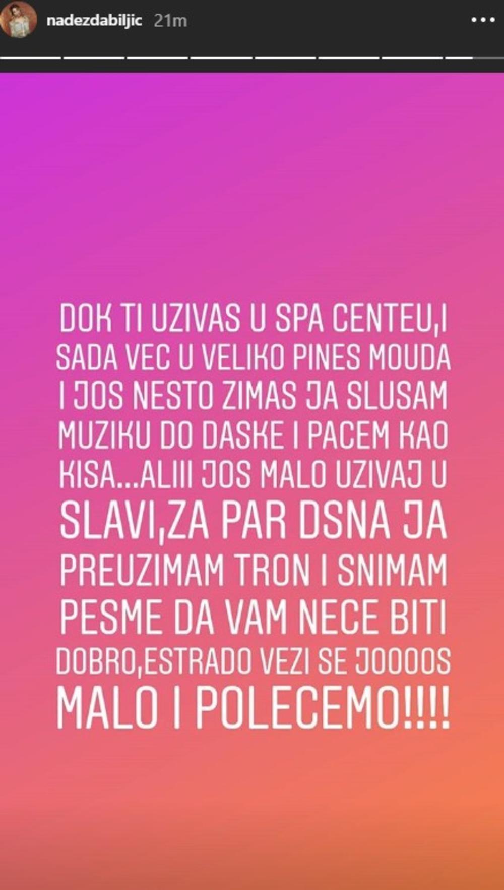 "Dok ti uživaš u spa centru i sada već uveliko piješ, a možda i još nešto uzimaš, ja slušam muziku do daske i plačem kao kiša. Ali, još malo uživaj u slavi, za par dana ja preuzimam tron i snimam pesme da vam neće biti dobro, estrado veži se, još malo i polećemo", napisala je Nadežda na svom Instagramu.