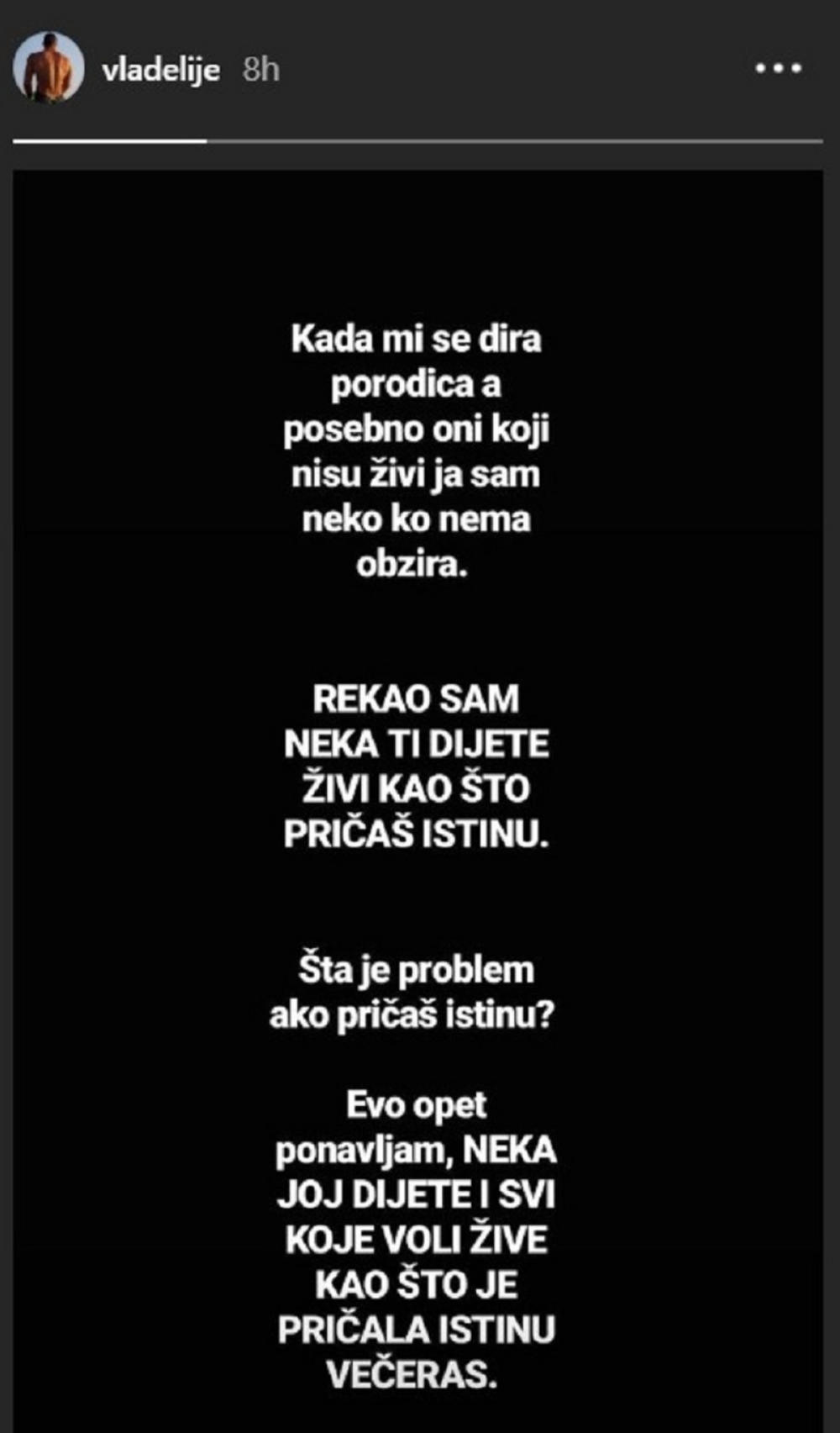 Kada mi se dira porodica, a posebno oni koji nisu živi, ja sam neko ko nema obzira! Rekao sam: "Neka ti dete živi, kao što pričaš istinu". Šta je problem ako pričaš istinu? Evo, opet ponavljam: "Neka joj dete i svi koje voli žive kao što je pričala istinu večeras", poručio je još jednom Tomović.