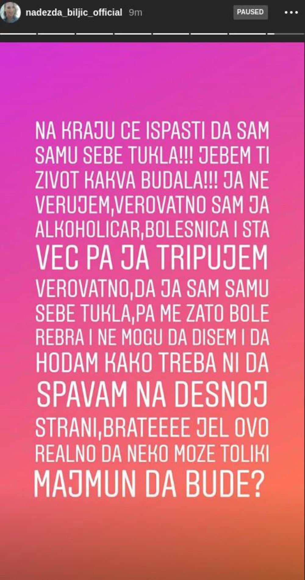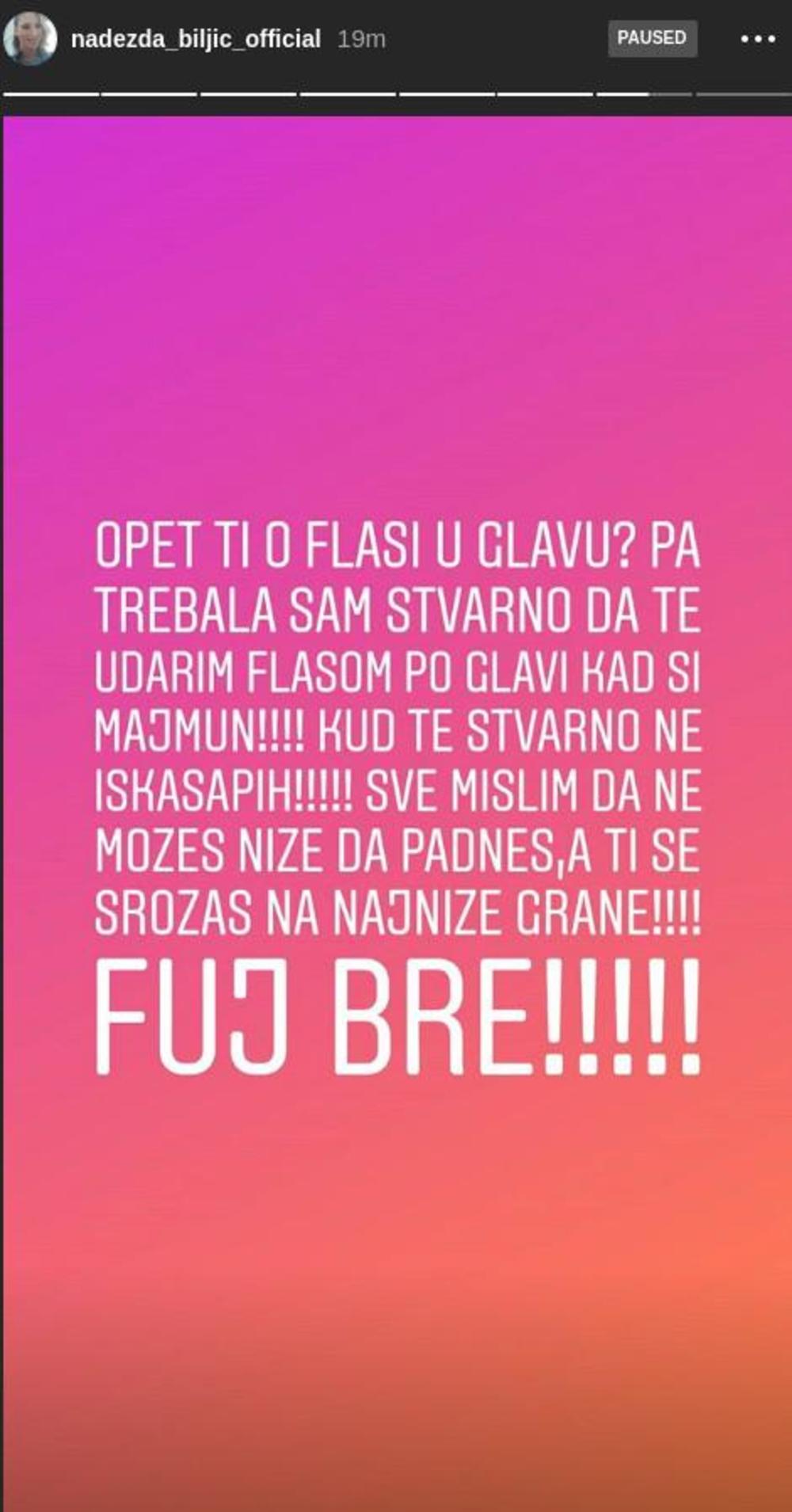 - Opet ti o flaši u glavu? Pa trebalo je stvarno da te udarim flašom po glavi kad si majmun! Kud te stvarno ne iskasapih! Sve mislim da ne možeš niže da padneš, a ti se srozaš na najniže grane! Fuj bre - napisala je Nadežda, pa dodala: