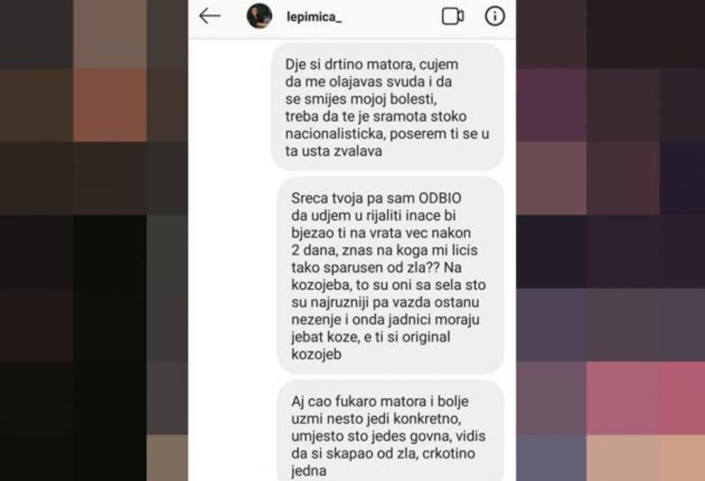 - Aj ćao, fukaro matora i bolje uzmi nešto jedi konkretno, umesto što jedeš g*vna, vidiš da si skapao od zla, crkotino jedna. Inače, znam o tebi mnogo više nego što misliš, baš od ljudi iz istog onog Sarajeva u koje ne smeš ni da odeš, jer si pevao kako ga treba sravniti sa zemljom. Stidi se g*zice kad obraza nemaš! Poznat si jedino po pesmi "Muslimani, bolje da vas nema" i to je sramota i greota što takvo zlo poput tebe ima prostora u medijima. Ćerka i žena te se stide, p*čkice matora. Imaš 40 kilograma sa sve pelenama, a k*rčiš se nešto... E, jado, jadni, hahahaha... Vređaš devojke koje mogu unuke da ti budu, nazivaš ih dr*ljama i p*šačicama k**čeva, a zapravo si ga ti jedino isp*šio, fukaro nacionalistička. Ja, nažalost, jesam bolestan, ali bolest nije sramota, ali ljudska zloba poput tvoje je velika sramota i greh - poručuio je Tomović Lepom u privatnoj poruci na Instagramu, a ovaj mu je samo kratko odbrusio:
