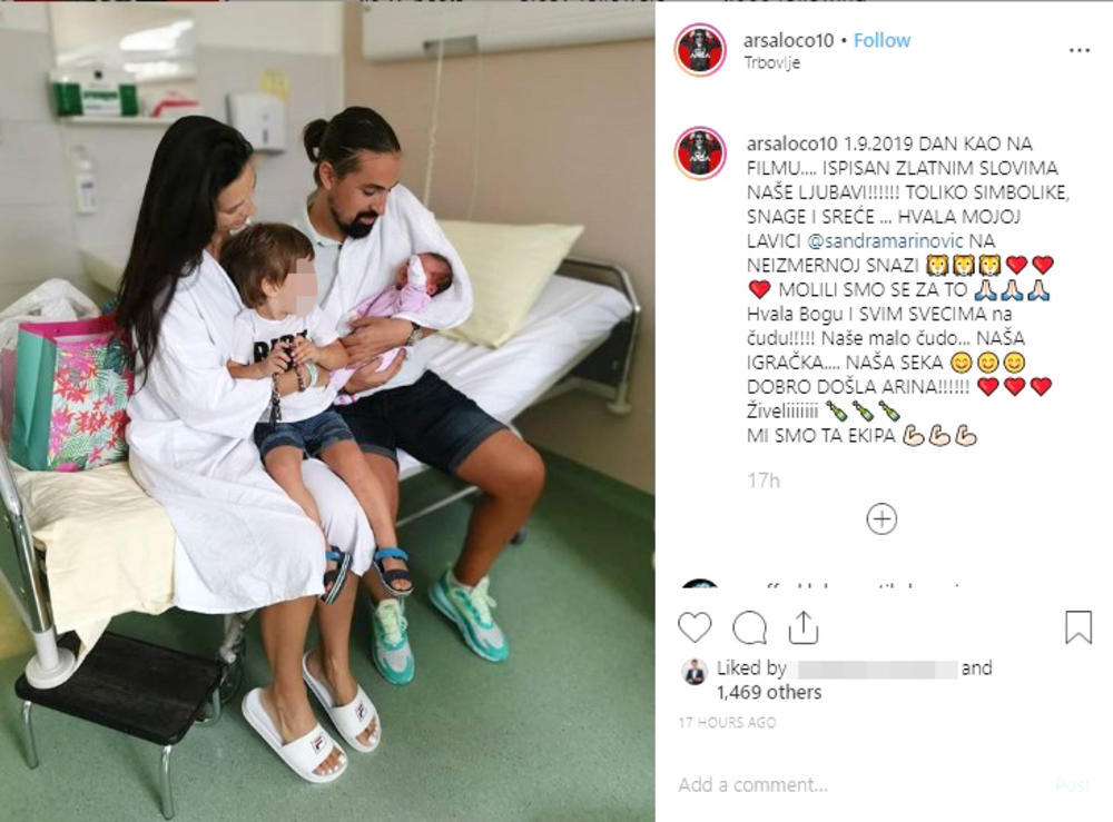 "1.9.2019. Dan kao na filmu. Ispisan zlatnim slovima naše ljubavi. toliko simbolike, snage i sreće. Havla mojoj lavici Sandri Marinović na neizmernoj snazi. Molili smo se za to. Hvala Bogu i svim svecima na čudu. Naše malo čudo. Naša igračka. Naša seka. Dobro došla Arina. Živeli. Mi smo ta ekipa", napisao je Arsa sa velikom dozom emocije na svom Instagramu.