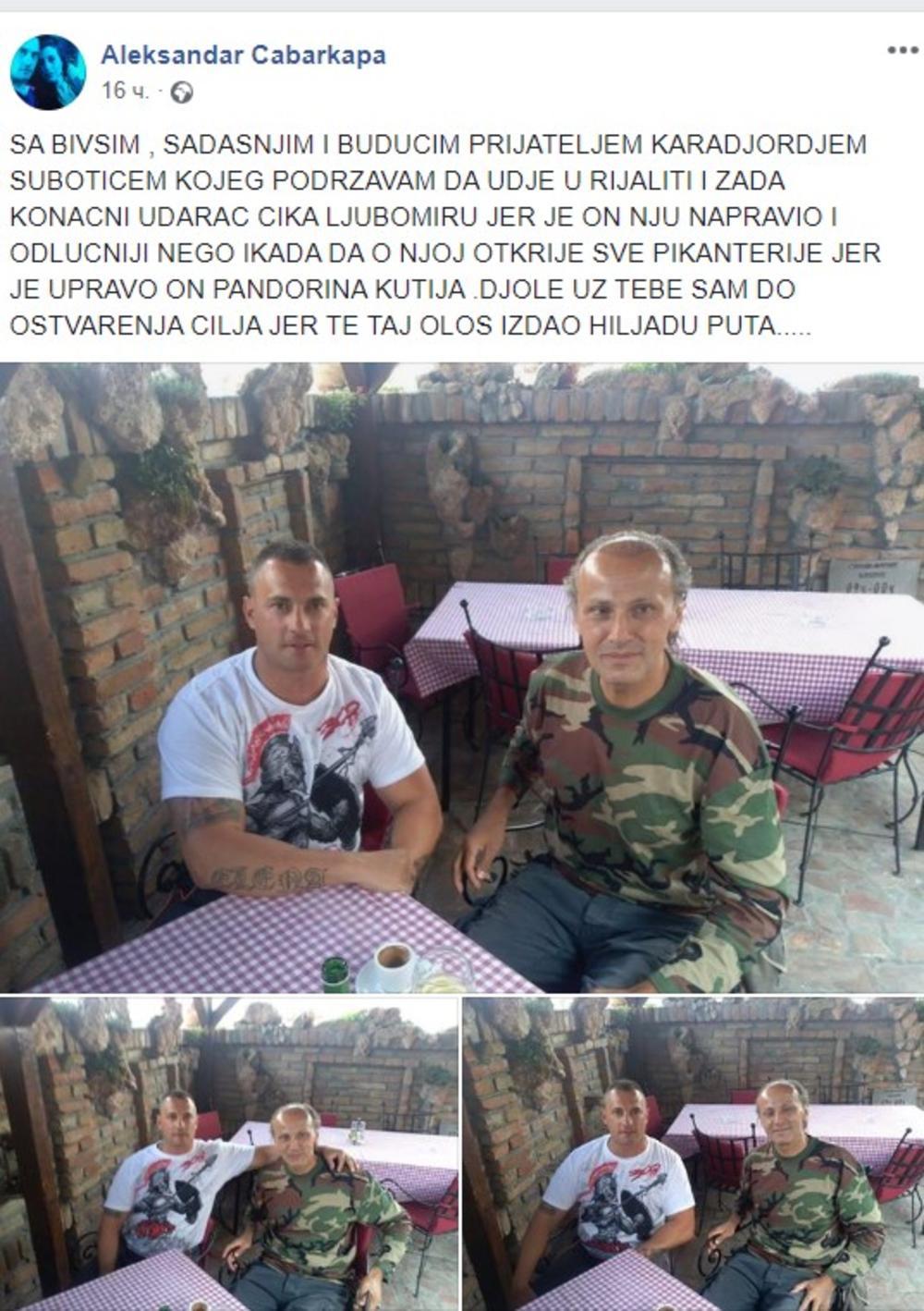 "Sa bivšim, sadašnjim i budućim prijateljem Karađorđem Subotićem kojeg podržavam da uđe u rijaliti i zada konačni udarac čika Ljubomiru jer je on nju napravio i odlučniji nego ikada da o njoj otkrije sve pikanterije jer je upravo on Pandorina kutija. Đole, uz tebe sam do ostvarenja cilja jer te taj ološ izdao hiljadu puta", napisao je Čabarkapa na svom Fejsbuk profilu.