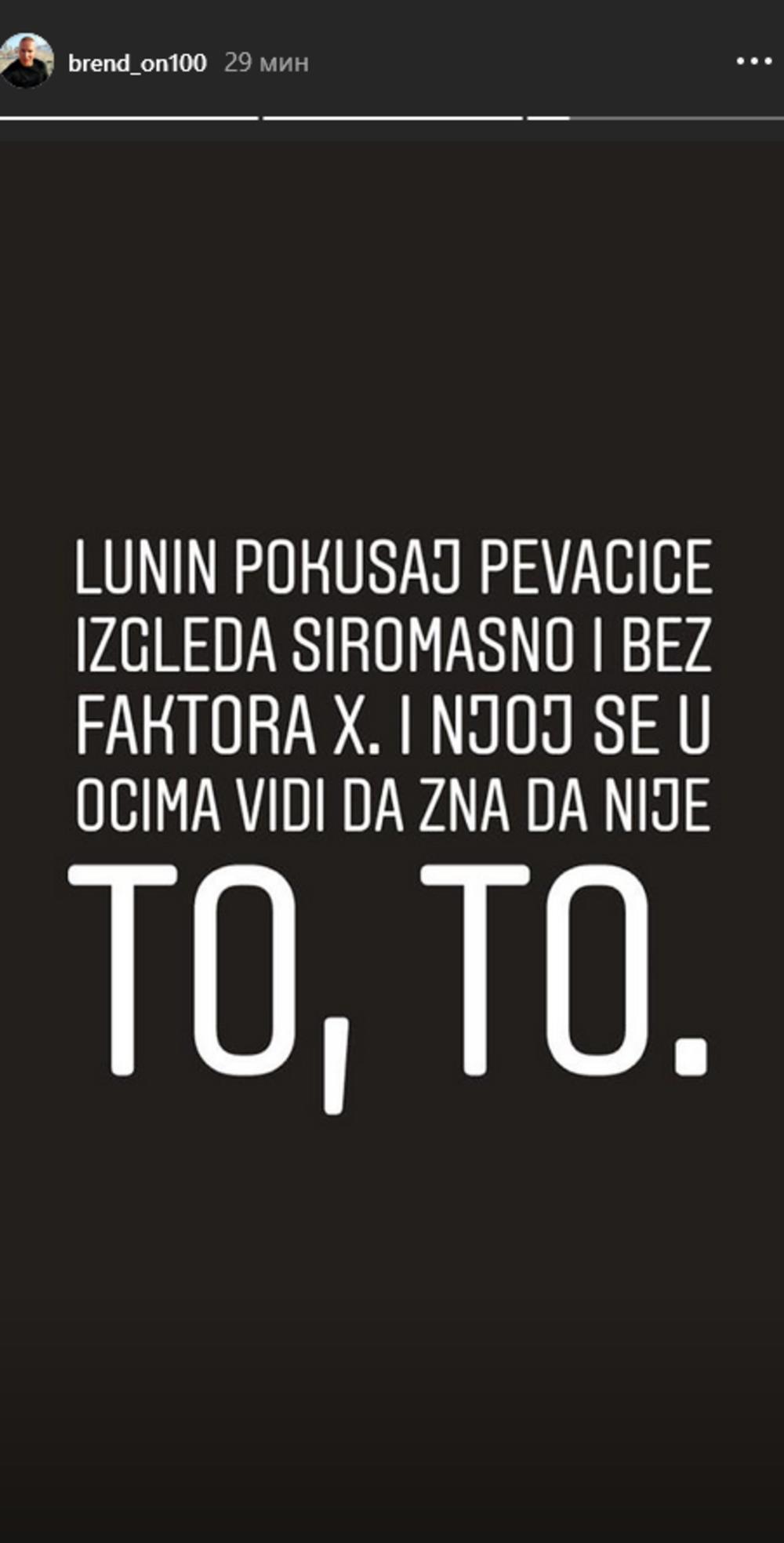 - Lunin pokušaj pevačice izgleda siromašno i bez faktora iks. I njoj se u očima vidi da zna da to nije to - napisao je Brendon.