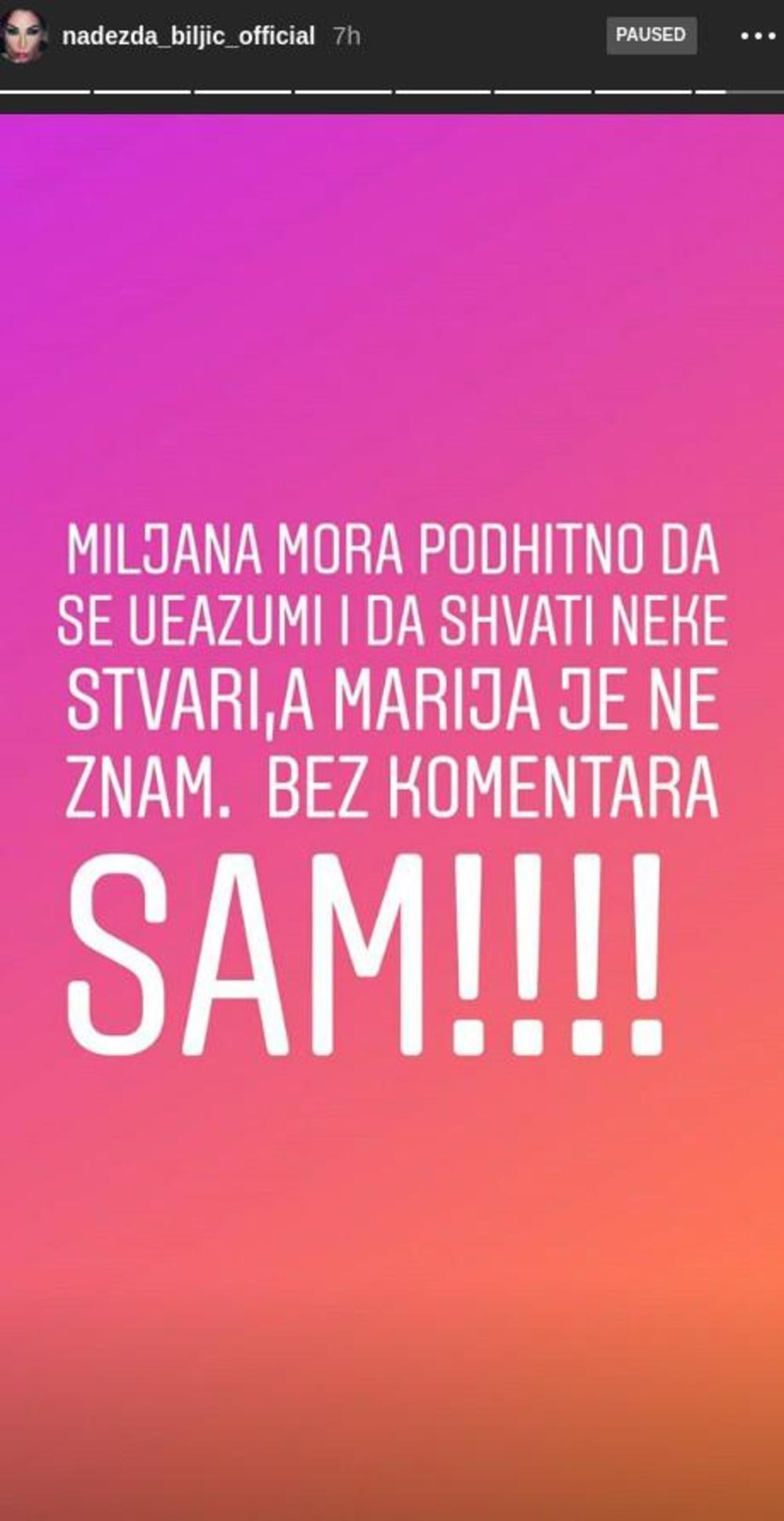 - Miljana mora pod hitno da se urazumi i da shvati neke stvari, a Marija je, ne znam. Bez komentara sam - napisala je Nadežda.