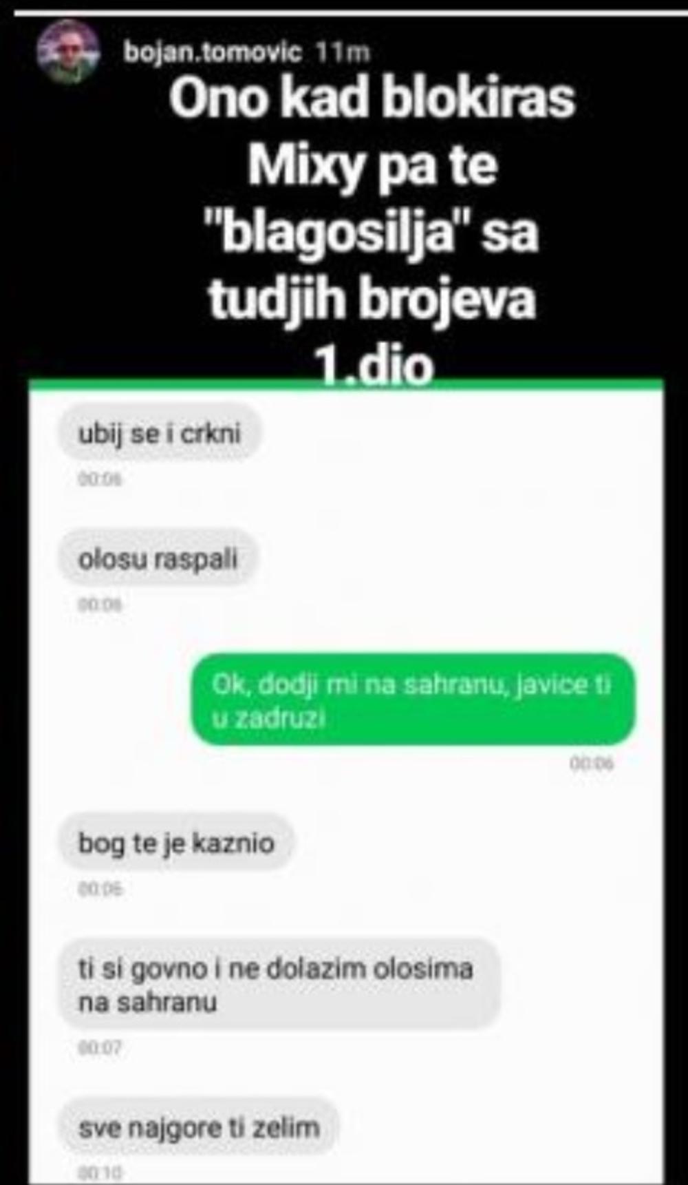 Na Tomovićevom Instagram profilu osvanuli su i printskrinovi pomenute prepiske, uz natpis: Ono kad blokiraš Miksi, pa te "blagosilja" sa tuđih brojeva!