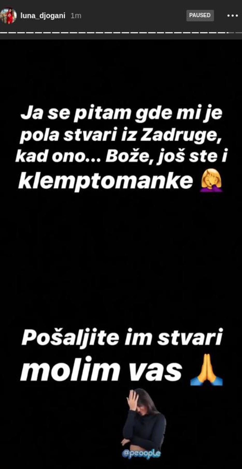 Ja se pitam gde mi je pola stvari iz Zadruge, kad ono... Bože, još ste i kleptomanke. Pošaljite im stvari, molim vas", poručila je Luna, mada nije konkretizovala na koga tačno misli, ali jasno je po slikama da je u pitanju Maja Marinković.