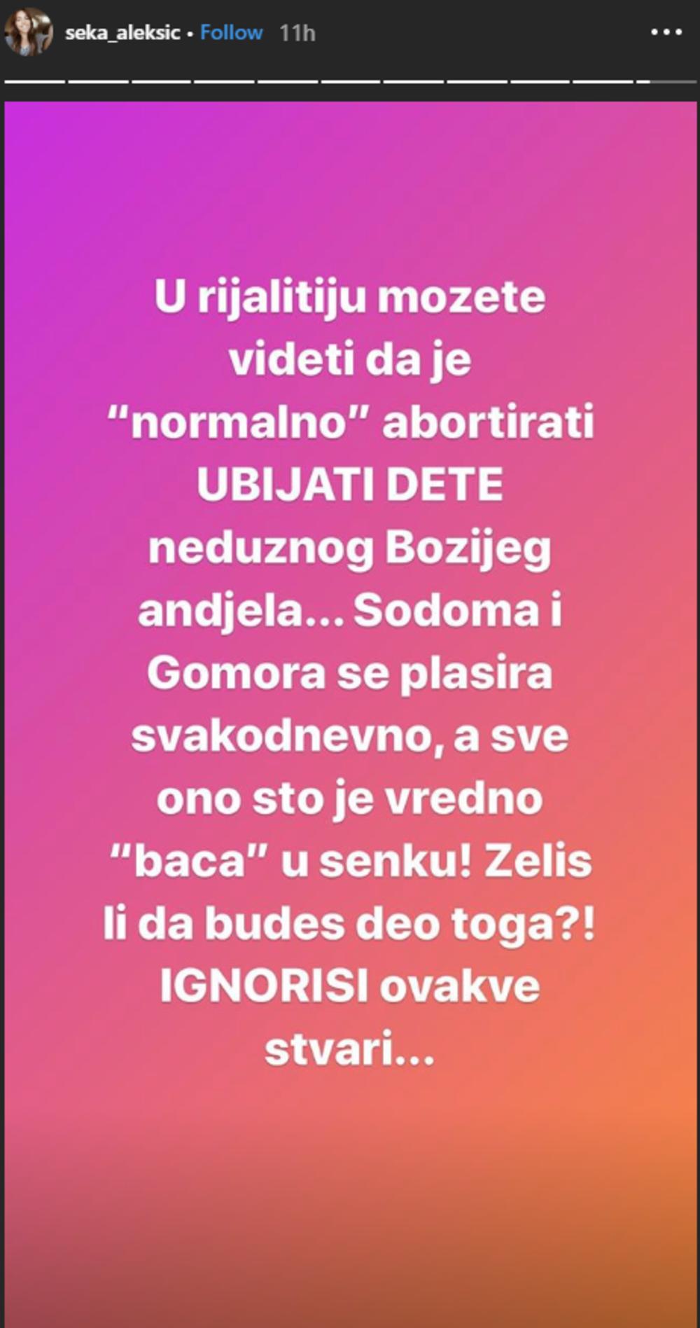 "U rijalitiju možete videti da je "normalno" aboratirati, ubijati dete nedužnog Božijeg anđela... Sodoma i Gomora se plasira svakodnevno, a sve ono što je vredno "baca" u senku! Želiš li da budeš deo toga?! Ignoriši ovakve stvari...", napisala je ona na svom Instagram profilu.