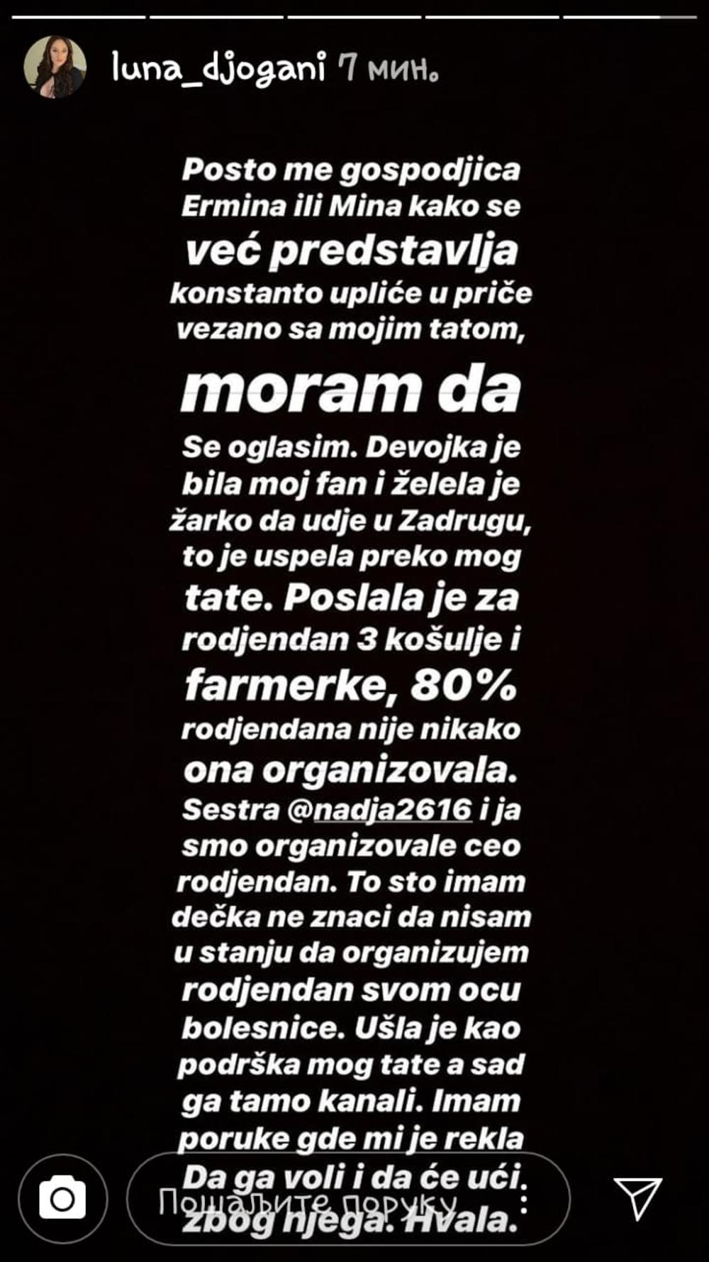 - Pošto me gospođica Ermina ili Mina kako se već predstavlja, konstantno upliće, u priče vezano sa mojim tatom, moram da se oglasim. Devojka je bila moj fan i želela je žarko da uđe u Zadrugu, preko mog tate. Poslala je za rođendan tri košulje i farmerke, 80% rođendana nije nikako ona organizovala. Sestra Nađa i ja smo organizovale ceo rođendan. To što imam dečka ne znači da nisam u stanju da organizujem rođendan svom ocu bolesnice. Ušla je kao podrška mog tate a sad ga tamo kanali. Imam poruke gde mi je rekla da ga voli i da će ući zbog njega. Hvala. - pisalo je na Instagram storiju Lune Đogani.