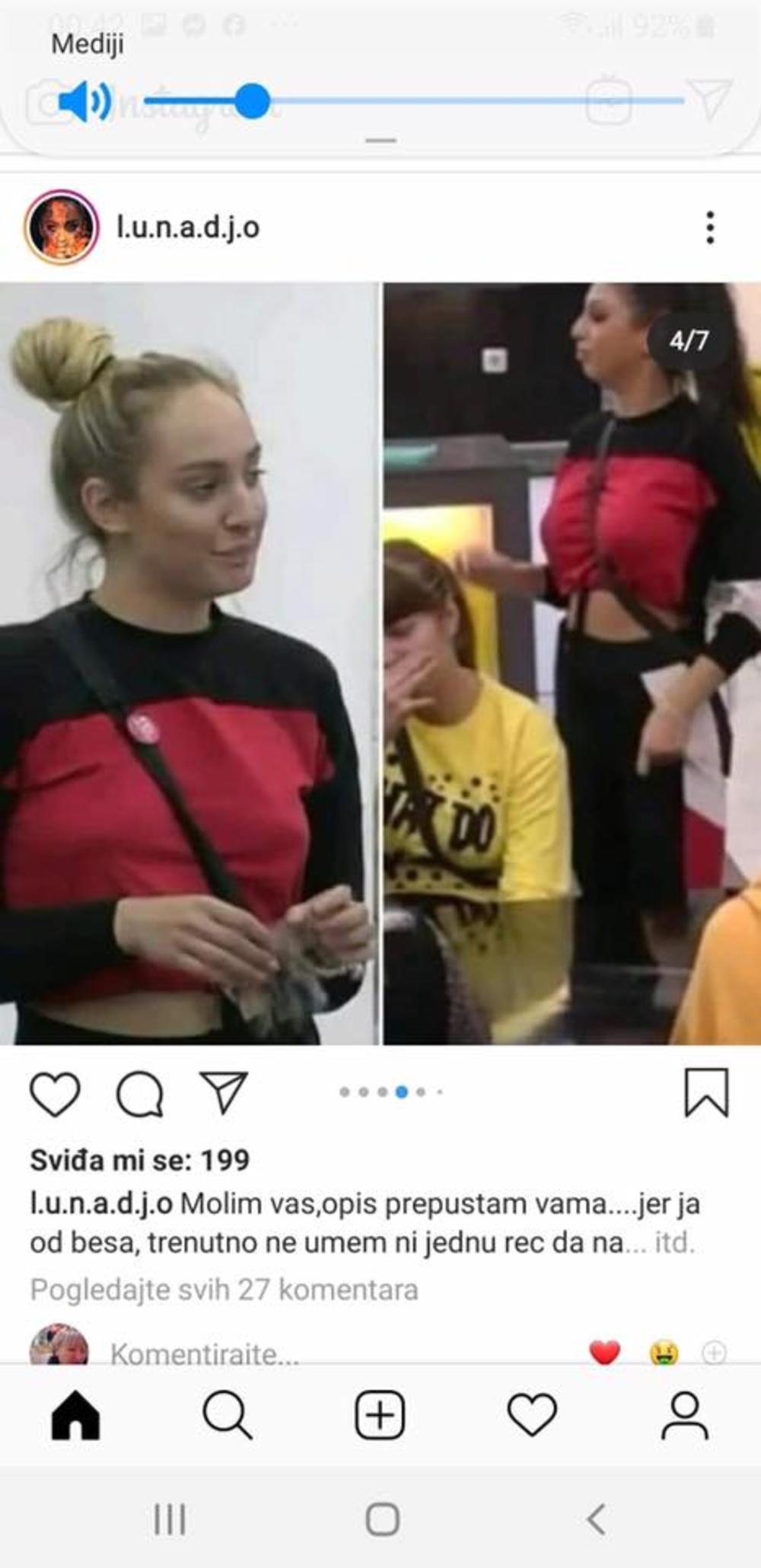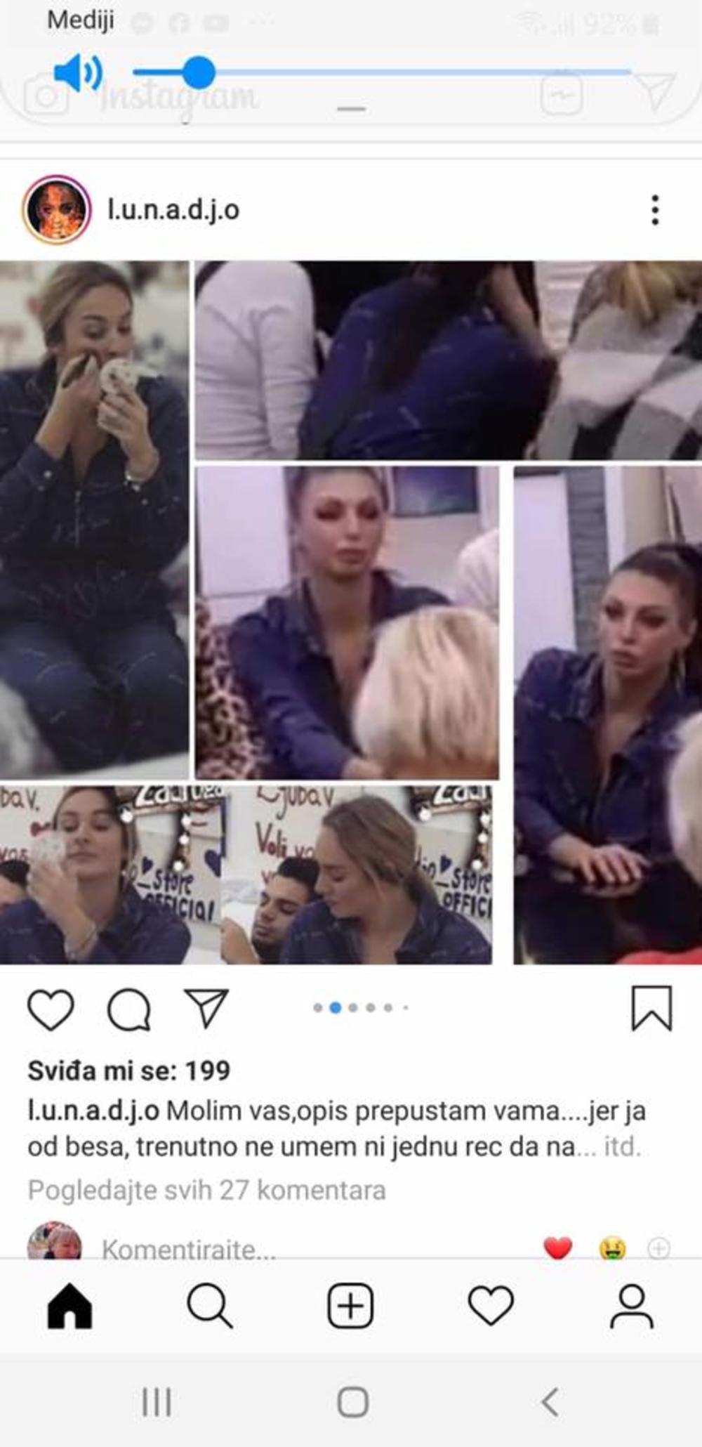Ja se pitam gde mi je pola stvari iz Zadruge, kad ono... Još si i kleptomanka. Pošaljite im stvari, molim vas", napisala je Luna na svojoj Instagram priči.