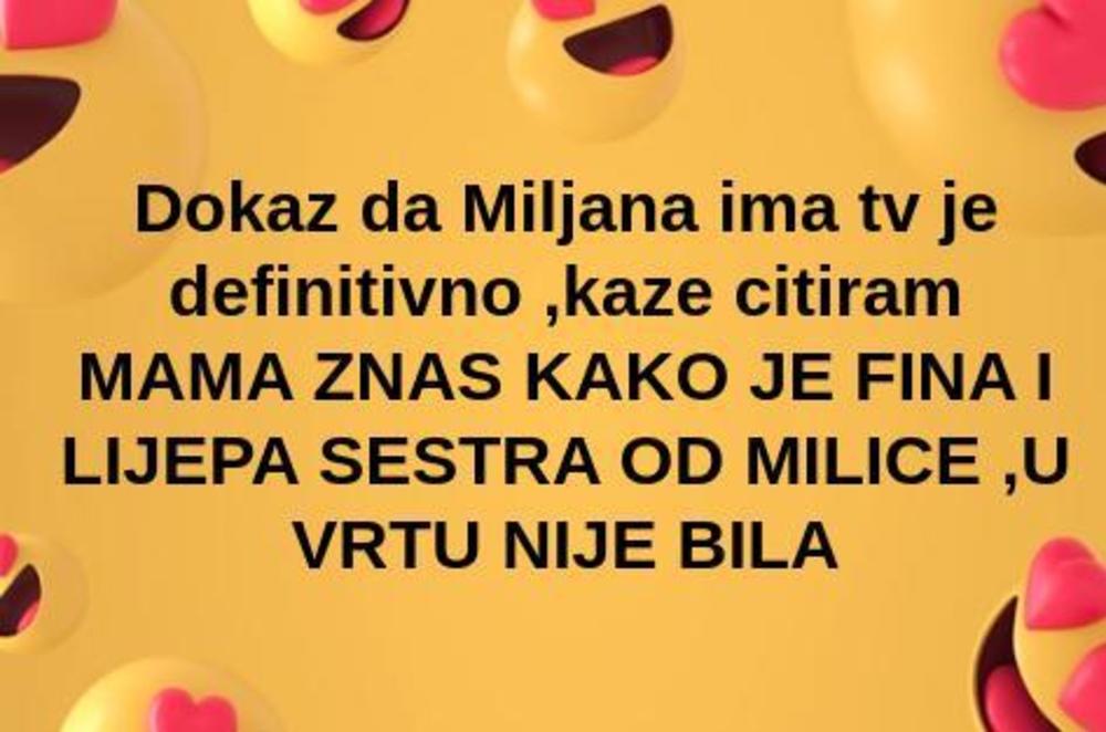 – Dokaz da Miljan ima tv je definitivan, kaže: Mama, zanaš kako je fina i lepa Miličina sestra, a u vrtu nije bila” – pisalo je u komentaru, a Miljana ovo ne bi mogla da zna osim ukoliko nema tv ili telefon da preko njega prati sve uživo.