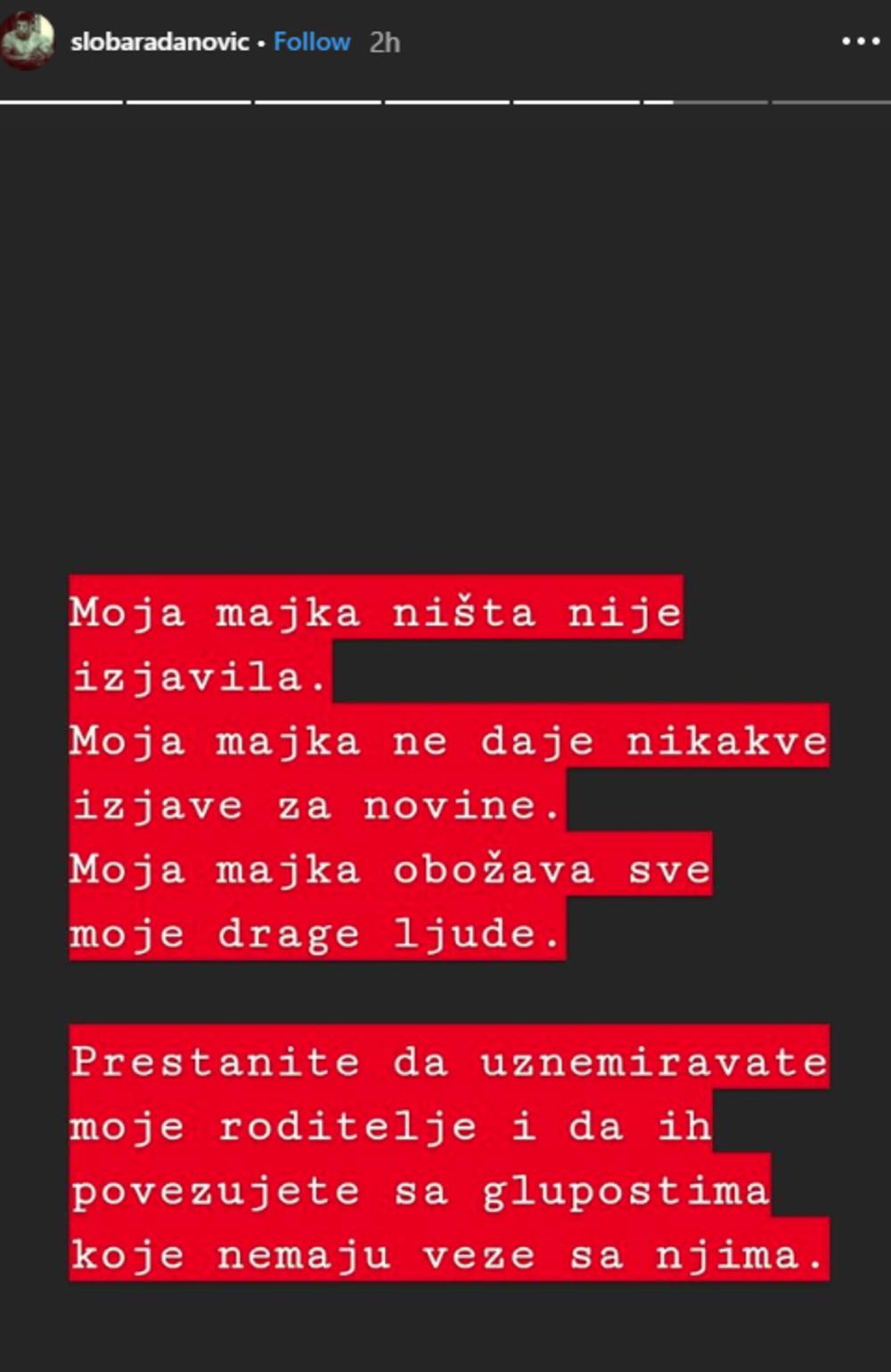 - Moja majka nije ništa izjavila. Moja majka ne daje nikakve izjave za novine. Moja majka obožava sve moje drage ljude. Prestanite da uznemiravate moje roditelje sa glupostima koje nemaju veze sa njima - poručio je pevač putem društvenih mreža.