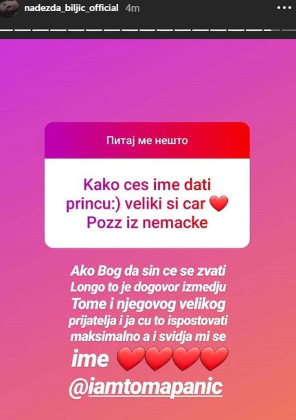 "Ako Bog da, sin će se zvati Longo. To je dogovor između Tome i njegovog velikog prijatelja, ja ću to maksimalno ispoštovati, a i sviđa mi se ime", napisala je Biljićeva.