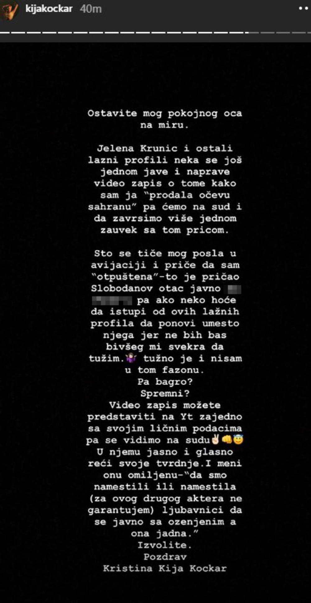 "Ostavite mog pokojnog oca na miru. Jelena Krunić i ostali lažni profili neka se još jednom jave i naprave video zapis o tome kako sam ja "prodala očevu sahranu", pa idemo na sud i da završimo više jednom zauvek sa tom pričom. Što se tiče mog posla u avijaciji i priče da sam "otpuštena", to je pričao Slobodanov otac javno, pa ako neko hoće da istupi od ovih lažnih profila da ponovi umesto njega, jer ne bih baš bivšeg mi svekra da tužim. Tužno je i nisam u tom fazonu", napisala je Kija i dodala: