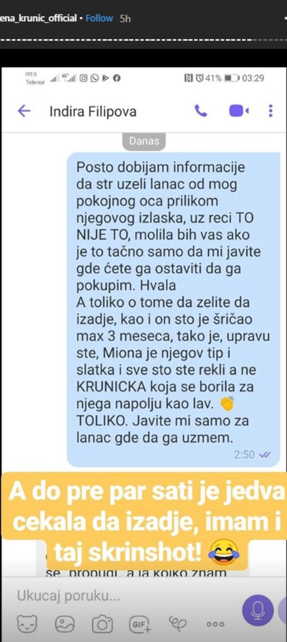 "Molim vas, javite mi gde uzmem lanac. A do pre par sati je jedva čekala da izađe", pisala je Krunićka.