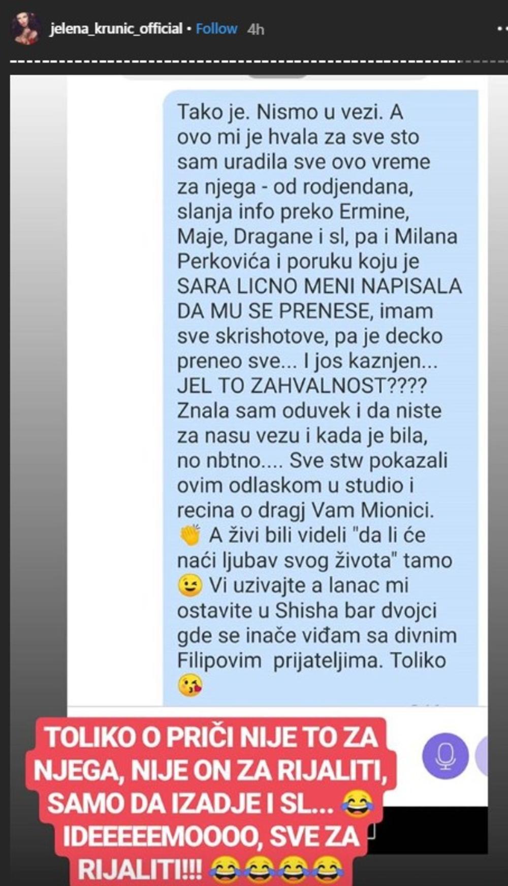 Jelena Krunić, koju je dečko Filip Reljić ostavio pred celom nacijom i vratio krst njenog pokojnog oca koji mu je dala, besna i razočarana oglasila se na Instagramu.