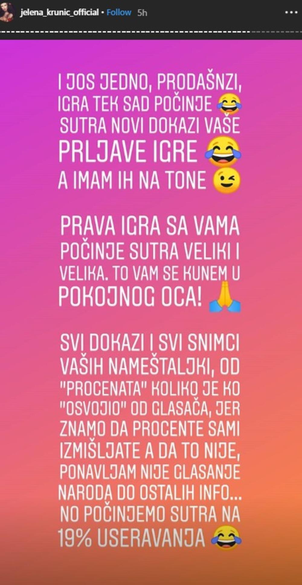 "Prljava igra tek počinje, zaklinjem vam se u pokojnog oca. Svi dokazi i sve nameštaljke, od procenata koliko je ko osvojio, do glasača jer znamo da procente izmišljaš", napisala je između ostalog Krunićeva.