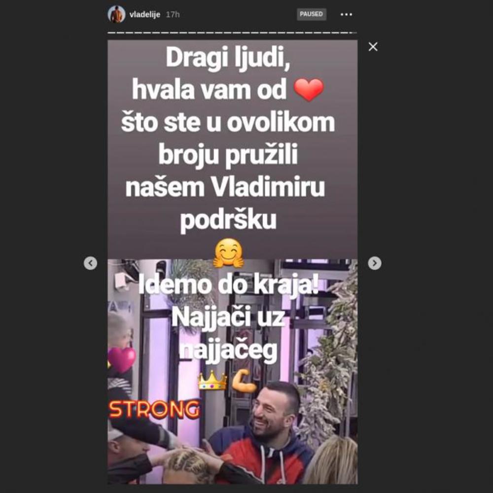 Ispratili smo Vladimirov Instagram profil, koji vodi njegov brat, dok je on u "Zadruzi", te smo i videli objavu u Instagram storiju, gde se sa Vladimirovog profila njegov brat, ili sam on zahvaljuje na podršci.