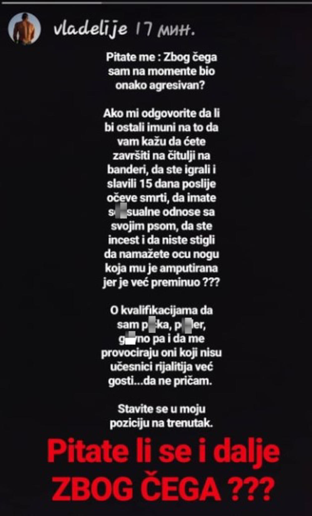 - Pitate li i dalje zbog čega?! Pitate me zbog čega sam na momente bio onako agresivan? Ako mi odgovorite da li bi ostali imuni na to da vam kažu da ćete završiti na čitulji, da ste igrali i slavili 15 dana posle očeve smrti, da imate s*ksualne odnose sa svojim psom, da ste incest, da niste stigli da namažete ocu nogu koja mu je amputirana jer je već preminuo? - napisao je Tomović, pa dodao: