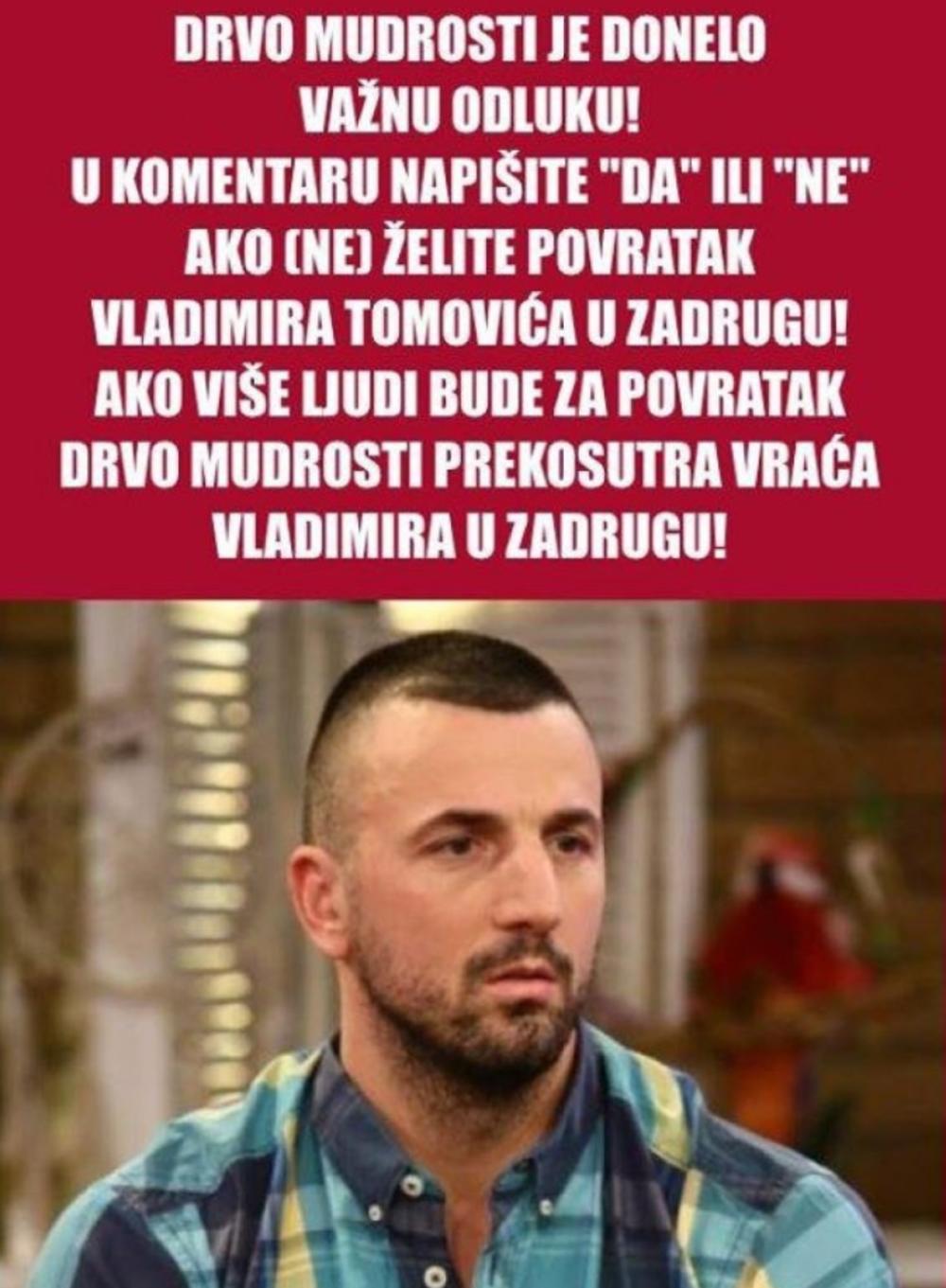 - Drvo mudrosti je donelo važnu odluku! U komentaru napišite "da" ili "ne" ako (ne)želite povratak Vladimira Tomovića u Zadrugu! Ako više ljudi bude za povratak, Drvo mudrosti prekosutra vraća Vladimira u Zadrugu - pisalo je u objavi.