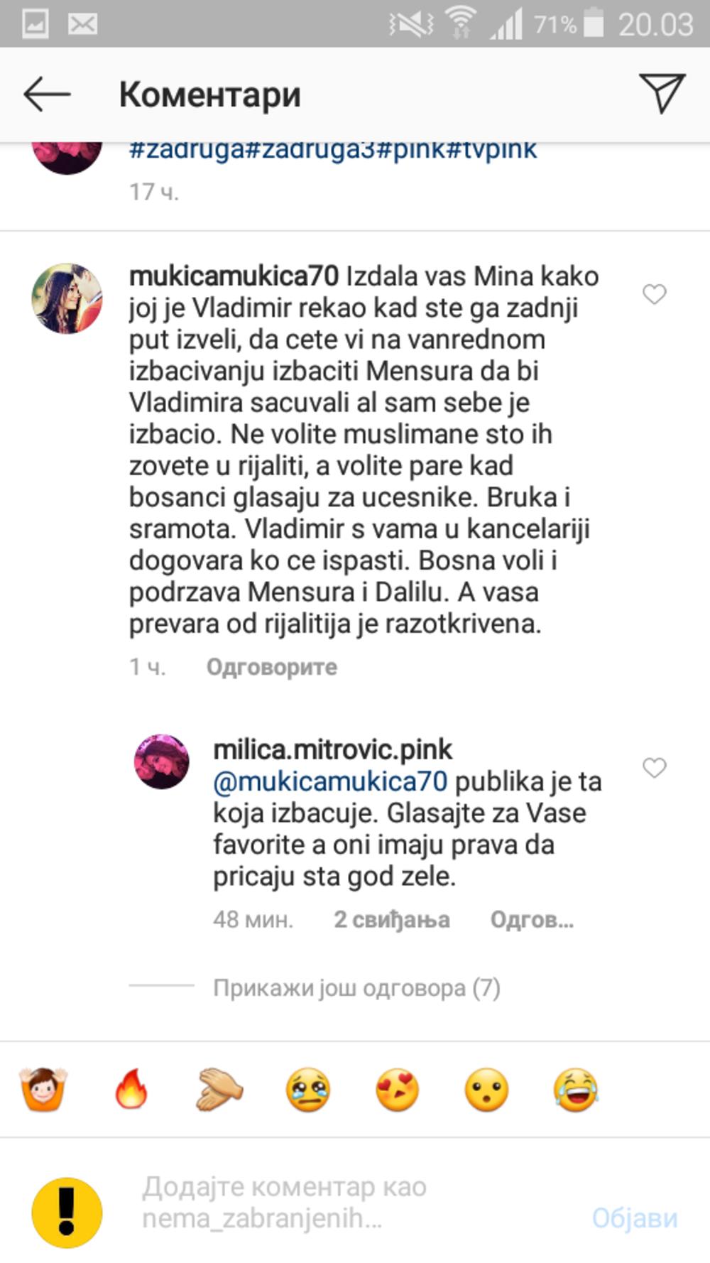 – Izdala vas Mina kako joj je Vladimir rekao kad ste ga zadnji put izveli, da ćete na vanrednom izbacivanju izbaciti Mensura da bi Vladimira sačuvali, ali sam sebe je izbacio. Ne volite muslimane što ih zovete u rijaliti, a volite pare kada Bosanci glasaju za učesnike. Bruka i sramota. Vladimir sa vama u kancelariji dogovara ko će ispasti. Bosna voli i podržava Mensura i Dalilu. A vaša prevara od rijalitija je razotkrivena – stoji u komentaru ispod objave rejtinga „Zadruge“ na profilu Milice Mitrović.