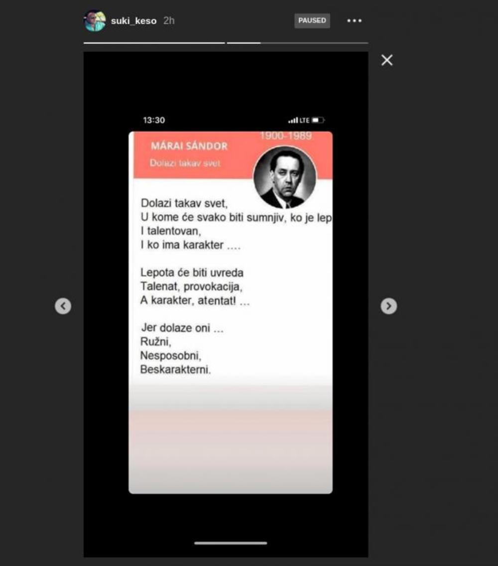 - Dolazi takav svet, u kome će svako biti sumnjiv, ko je lep i talentovan, i ko ima karakter... Lepota će biti uvreda, talenat provokacija, a karakter atentat... Jer dolaze oni, ružni, nesposobni, beskarakterni - pisalo je na slici na Instagramu, citat pesme "Dolazi takav svet", koji je napisao Marai Šandor.