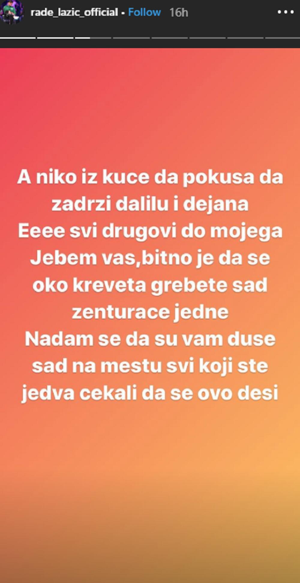 - A niko iz kuće da pokuša da zadrži Dalilu i Dejana. Eeee svi drugovi, do mojega. J*bem vas, bitno je da se oko kreveta grebete sad ženturače jedne. Nadam se da su vam duše sad na mestu, svi koji ste jedva čekali da se ovo desi - napisao je Teča iz Beča na svom Instagram profilu.