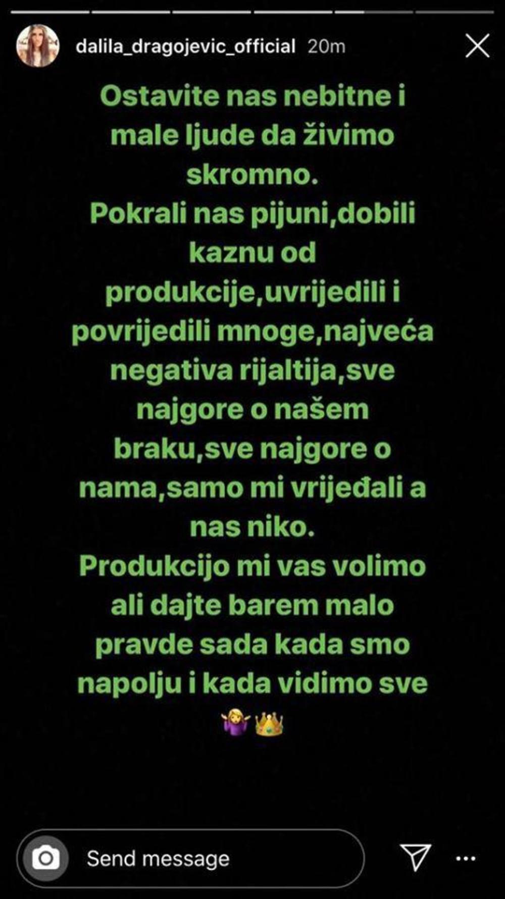 - Ostavite nas nebitne i male ljude da živimo skromno. Pokrali nas pijuni, dobili kaznu od produkcije, uvredili i povredili mnoge, najveća negativa rijalitija, sve najgore o našem braku, sve najgore o nama, samo mi vređali, a nas niko. Produkcijo mi vas volimo, ali dajte barem malo pravde sada kada smo napolju i kada vidimo sve - napisala je Dalila.