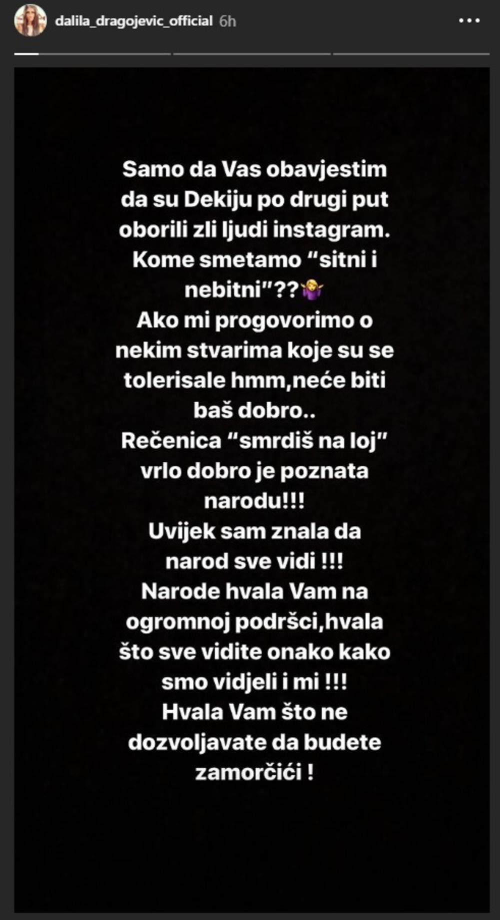 "Samo da vas obavestim da su Dekiju po drugi put oborili zli ljudi Instagram. Kome smetamo 'sitni i nebitni'? Ako mi progovorimo o nekim stvarima koje su se tolerisale hmm, neće biti baš dobro… Rečenica 'smrdiš na loj' vrlo je dobro poznata narodu! Uvek sam znala da narod vidi sve! Narode, hvala Vam na ogromnoj podršci, hvala što sve vidite onako kako smo videli i mi! Hvala vam što ne dozvoljavate da budete zamorčići!" poručila je Dalila svojim fanovima.