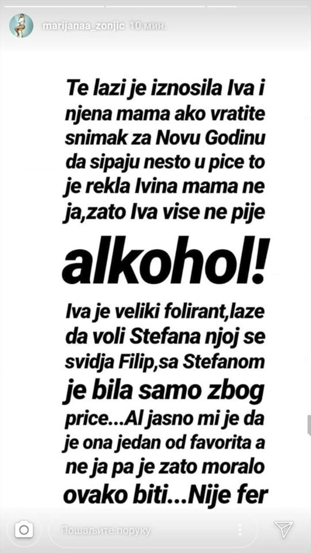 – Te laži je iznosila Iva i njena mama ako vratite snimak za Novu godinu da sipaju nešto u piće to je rekla Ivina mama ne ja, zato Iva više ne pije alkohol! Iva je veliki folirant, laže za voli Stefana njoj se sviđa Filip, sa Stefanom je bila samo zbog priče… Al jasno je da je ona jedan od favorita, a ne ja, pa je zato moralo ovako biti… Nije fer – poručila je Marijana.