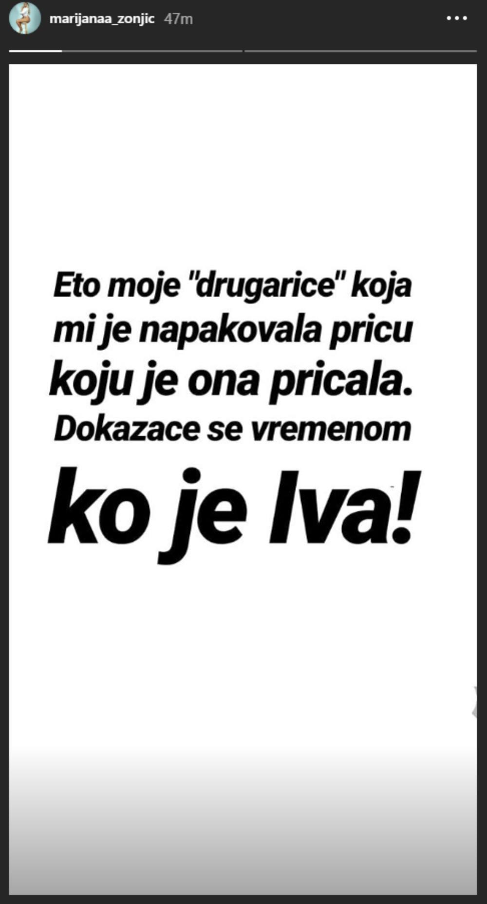 "Eto moje 'drugarice' koja mi je napakovala priču koju je ona pričala. Dokazaće se vremenom ko je Iva!" poručila je ona putem društvene mreže Instagram, ali nije se tu zaustavila.