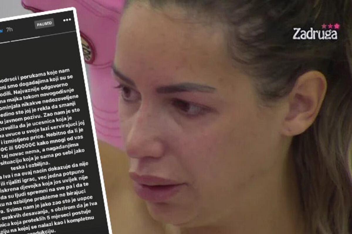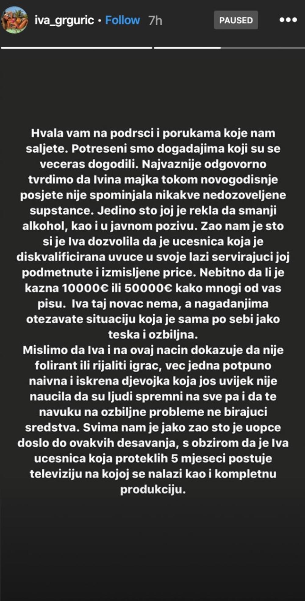 – Hvala vam na podršci i porukama koje nam šaljete. Potreseni smo događajima koji su se večeras dogodili. Najvažnije, odgovorno tvrdimo da Ivina majka tokom novogodišnje posete nije spominjala nikakve nedozvoljene supstance. Jedino što joj je rekla da smanji alkohol, kao i u javnom pozivu. Žao nam je što je Iva sebi dozvolila da je učesnica koja je diskvalifikovana, uvuče u svoje laži, servirajući joj podmetnute i izmišljene priče. Nebitno da li je kazna 10.000 evra ili 50.000 evra, kako mnogi od vas pišu. Iva taj novac nema, a nagađanjima otežavate situaciju koja je sama po sebi jako teška i ozbiljna. Mislimo da Iva i na ovaj način dokazuje da nije folirant ili rijaliti igrač, već jedna potpuno naivna i iskrena devojka, koja još uvek nije naučila da su ljudi spremni na sve, pa i da te navuku na ozbiljne probleme, ne birajući sredstva. Svima nam je jako žao što je uopšte došlo do ovakvih dešavanja, s obzirom na to da je Iva učesnica koja proteklih pet meseci poštuje televiziju na kojoj se nalazi, kao i kompletnu produkciju – napisali su administratori Ivinog Instagram profila.