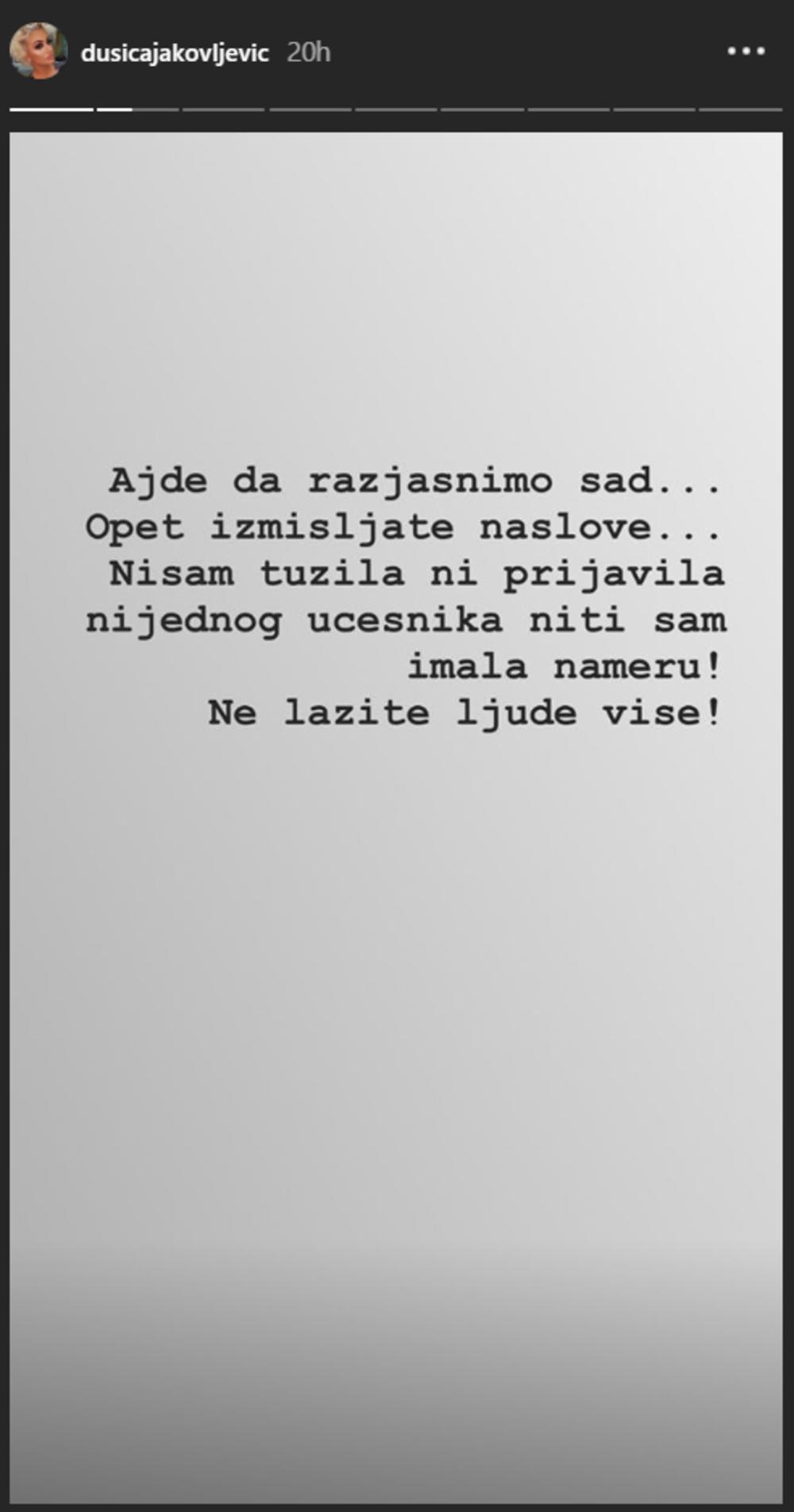 - 'Ajde da razjasnimo sad... Nisam tužila, ni prijavila nijednog učesnika, niti sam imala nameru - napisala je Dušica.