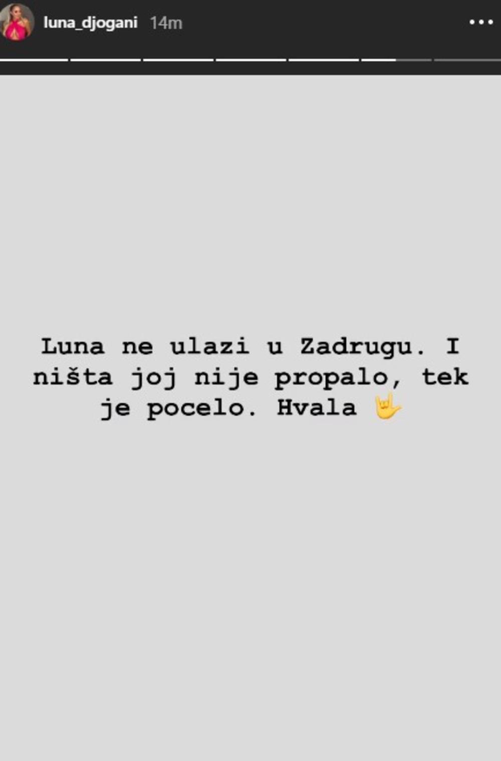 "Luna ne ulazi u "Zadrugu". I ništa joj nije propalo tek je počelo. Hvala", napisala je Đoganijeva.