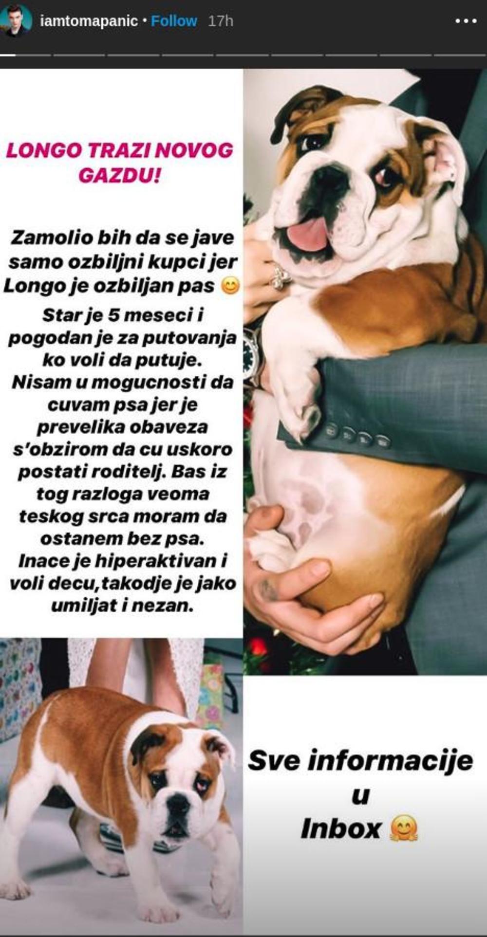 - Longo traži novog gazdu! Zamolio bih da se jave samo ozbiljni kupci, jer Longo je ozbiljan pas. Star je 5 meseci i pogodan je za putovanja, ko voli da putuje. Nisam u mogućnosti da čuvam psa, jer je prevelika obaveza s obzirom da cu uskoro postati roditelj. Baš iz tog razloga, veoma teškog srca, moram da ostanem bez psa. Inače je hiperaktivan i voli decu, takođe je jako umiljat i nežan - napisao je Toma.