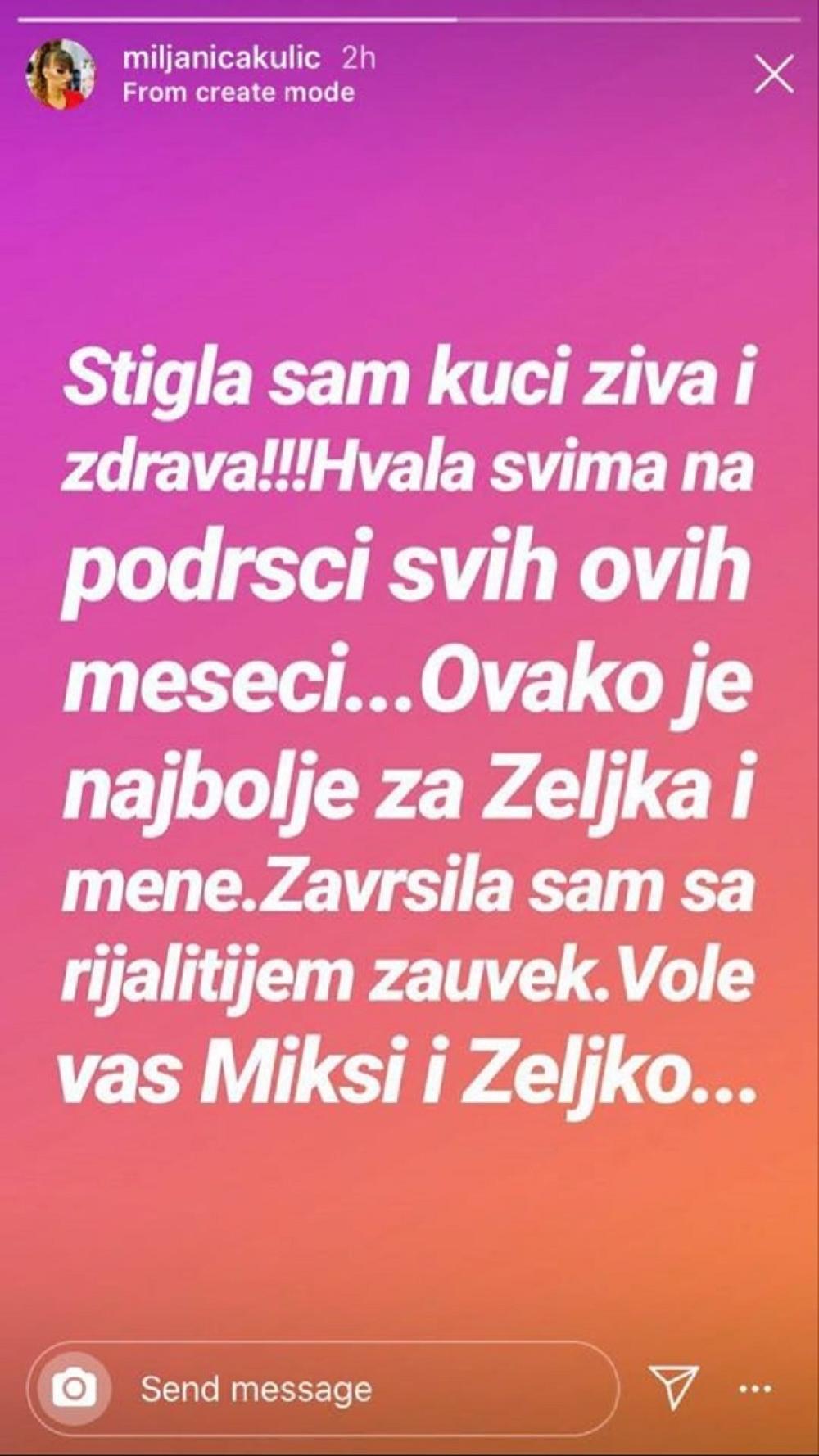 "Stigla sam kući živa i zdrava. Hvala svima na podršci svih ovih meseci. Ovako je najbolje za Željka i mene. Završila sam sa rijalitijem zauvek. Vole vas Miksi i Željko", napisala je Kulićeva.