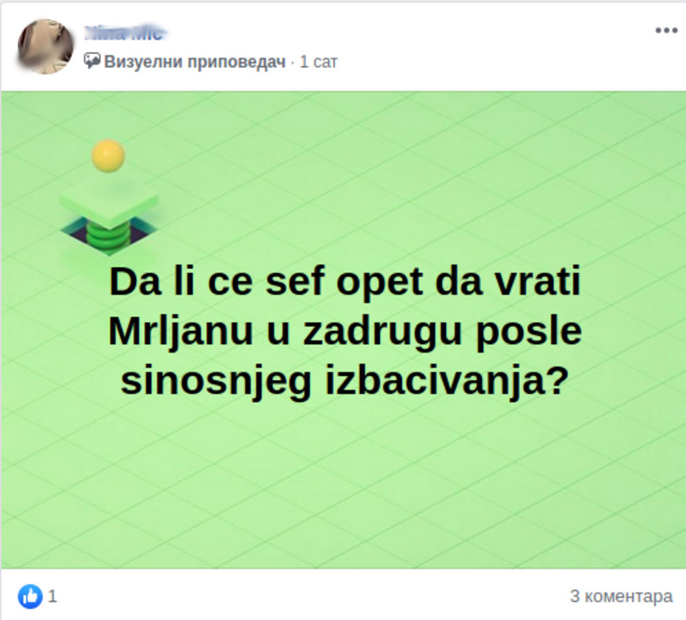 Ipak, kao što je i za očekivati, izbacivanje istaknute takmičarke, kakva je Miljana, izazvalo je veliku pažnju vernih gledalaca "Zadruge". Na društvenim mrežama počeli su da pljušte komentari o najnovijim događajima, a mnogi su izrazili nevericu i mišljenje da će se Miljana ipak ubrzo vratiti u Imaginarijum.
