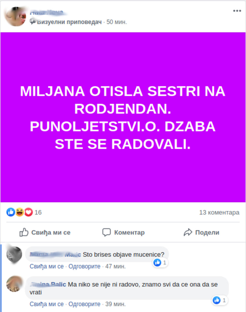 - Miljana otišla sestri na rođendan. Punoletstvo. Džaba ste se radovali - glasi jedan od postova na Fejsbuku.