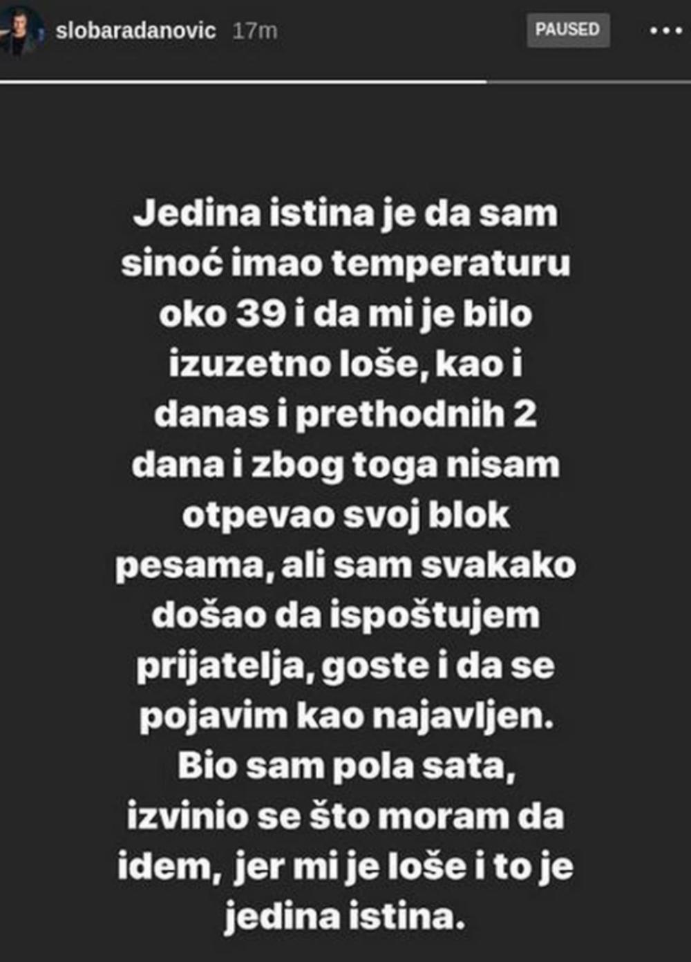 - Jedina istina je da sam sinoć imao temperaturu oko 39 i da mi je bilo izuzrtno loše, kao i danas, i prethodnih dva dana i zbog toga nisam otpevao svoj blok pesama, ali sam svakako došao da ispoštujem prijatelja, goste i da se pojavim kao najavljen. Bio sam pola sata, izvinio se što moram da idem, jer mi je loše i to je jedina istina - napisao je Sloba Radanović na svom profilu.
