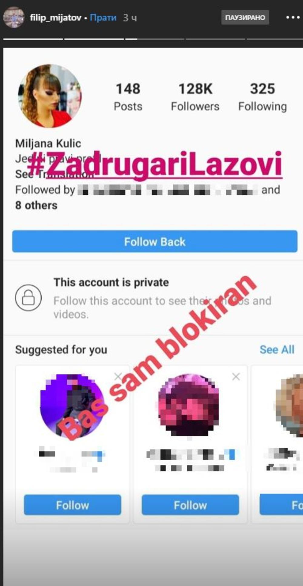 "Baš sam blokiran", napisao je na drugom Instagram storiju, gde je slika profila Miljane Kulić sa društvene mreže, koja njega prati, ali on nju ne.