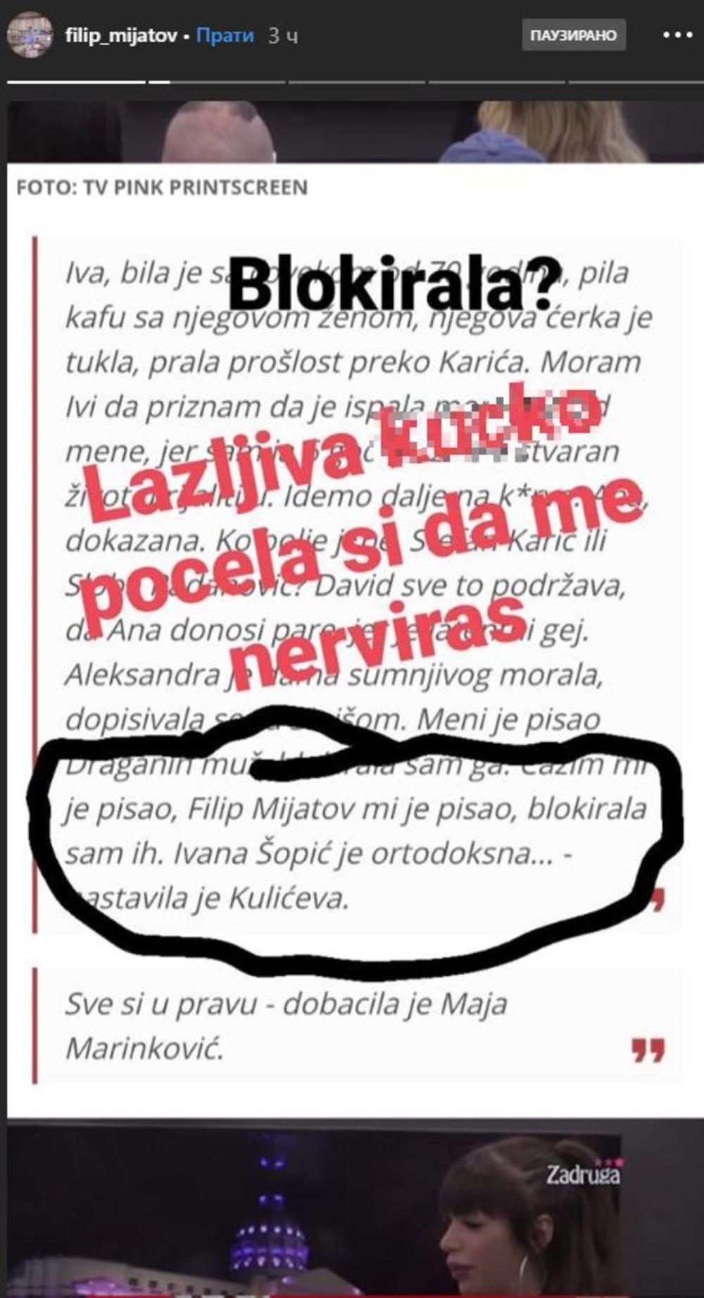 "Blokirala? Lažljiva k*čko, počela si da me nerviraš", napisao je Filip Mijatov na svom prvom Instagram storiju, pa dodao: