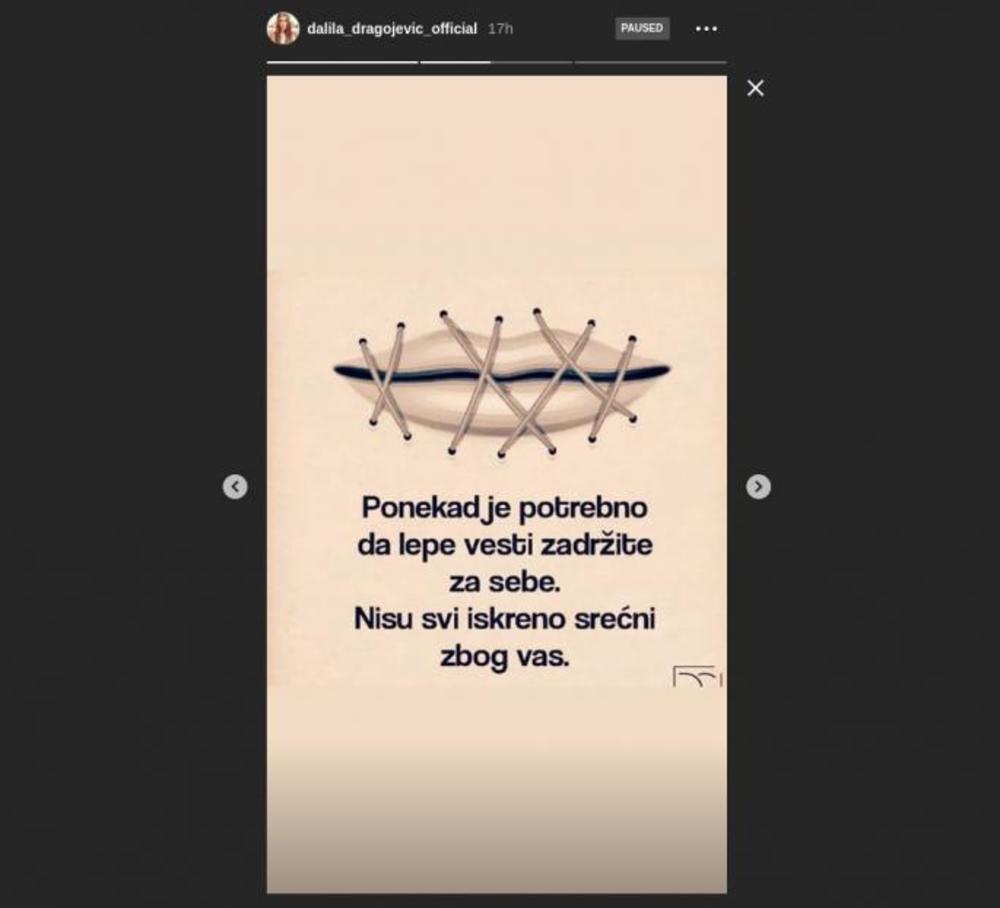 – Ponekad je potrebno da lepe vesti zadržite za sebe. Nisu svi iskreno sretni zbog vas – napisala je ona na svom Instagram storiju.