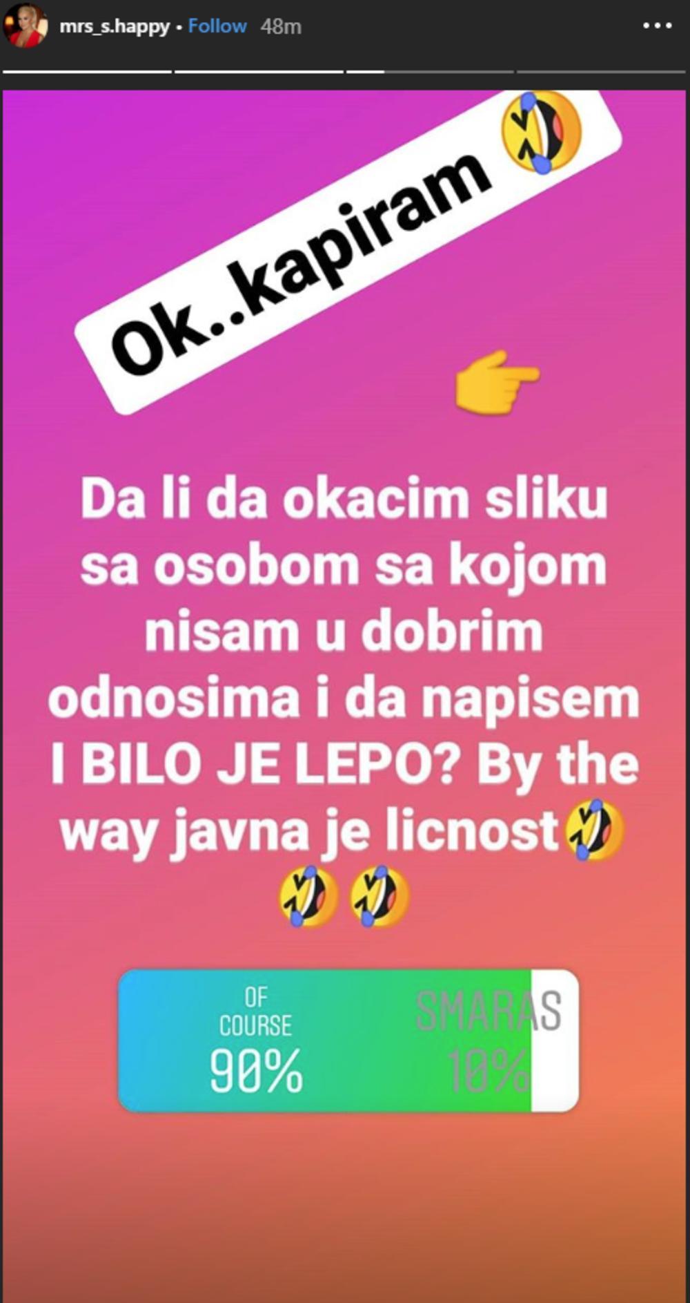 - Da li da okačim sliku sa osobom sa kojom nisam u dobrim odnosma i da napišem ,,Bilo je lepo"? Inače, u pitanju je javna ličnost, upitala je Sanja, a njeni pratioci su glasali da žele da vide ko je u pitanju.
