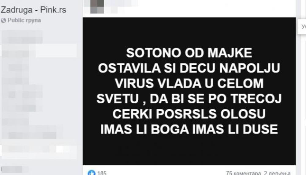 - Sotono od majke, ostavila si decu napolju, virus vlada u celom svetu, da bi se po trećoj ćerki posr*la, ološu, imaš li Boga, imaš li duše? - glasio je jedan od komentara gledalaca na Fejsbuk društvenoj mreži "Zadruge", a ima ih dosta!